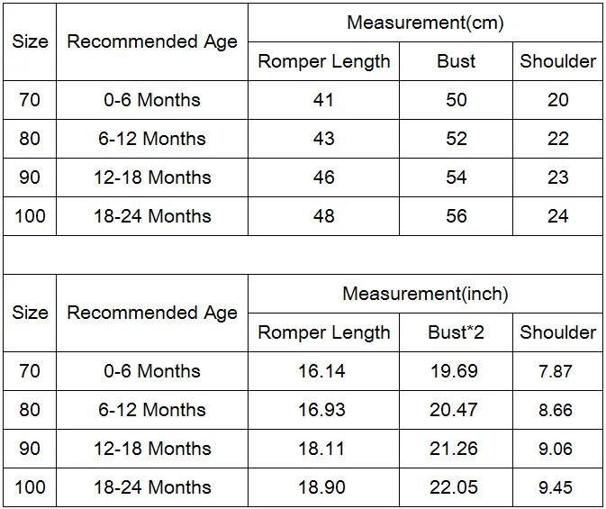 Hello! Welcome to our store!Fashion Newest Newborn Baby Girls Rompers Outfits !!High quality and Brand new 100%Main Color: AS The PictureNew in FashionAttention plz: If your kid is chubby, we recomend choosing a larger size, thanks.Please kindly refer to your kids actual height and the size chart before buying/bidding. Thanks.Package included: 1x RompersSize Chart:There is 2-3% difference according to manual measurement.please check the measurement chart carefully before you buy the item.1 inch = 2.54 cmPlease note that slight color difference should be acceptable due to the light and screen.Dear thanks for your order, if your order is over 100$ you can contact me,I will give you some discount or send you by a faster shipping way,have a nice day.we will do our best for you thanks.1.ShipmentItem will be soon shipped after payment cleared.Usually item will arrive within 15-45 business days after shipping it Depending on your country's distance and transportation.we do want the itm soon arrive to you.You can refer to ours Estimated Delivery Time in the website.2.RefundThanks for your order,if your package is not arrived in a long time,pls do not worry,you can contact us soon and I will help you to search the parcel instead of open a dispute because it is really hurt us,if it really lost,do not worry your money we will refund to you,so you can not lose anything. We treat every customer with careful and considerate, to make customer satisfied and have a excellent,pleasant shopping.3.FeedbackThere is an old saying in China: "meeting is fate" .thanks for choosing our shop we will do our best for you,If you are satisfied with our product and service, please leave us 5 stars feedback.Please contact us before leaving any negative or neutral feedback. We will work with you to solve any problems. And after that, we can offer further exchange or refund service.Thank you for your understand.* If you have any question please feel free to contact us.