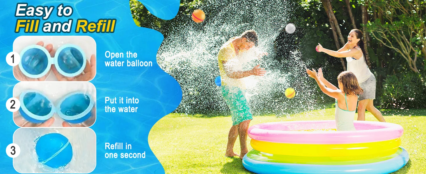 🌈【Reusable, Beautiful】Unique and environmentally friendly design. This reusable water bomb balloon uses highly durable high-quality silicone and the latest improved magnetic technology to bring you years of summer fun. This new summer outdoor toy uses a bright color design to reduce your child's screen time, encourage them to play outdoors with friends and family, and make you feel happy.☀️【Multiple Scenes】There are many outdoor funs at the beach, pool, etc.: put up a parasol, take a deep breath of sea water, and feel the fine sand between your toes. No toys to play with? Water balls – a must-have item for the beach – are particularly important in this scene. Outdoor toys suitable for children aged 3 to 10 are ideal for the beach or pool at the seaside. Water balls are classic toys in summer and are a must-have toy for places such as parks, courtyards or beaches.💦【Self-sealing】Easy to fill and clean: Are you still worried about the accumulation of balloon debris? Unlike most disposable water balls, our reusable water bomb balloons do not need to be inflated, tied or cleaned. Simply place the balloons in the water and they will immediately begin to fill with water and automatically deflate when bumped or squeezed.🎁【Summer Toys and Great Gifts】Best Gift Idea: Almost everyone, including children, adults, students, pets, etc. can use our water balls. Great for groups and the whole family to have fun together. This water ball is suitable for boys and girls aged 3 to 8 years old, and can be used as a fun water toy or a snack for birthday parties. It can be used in swimming pools, oceans, beaches, lakes, and rivers. Don't worry, create a pleasant summer experience for your kids!⚠Please note:1. Due to different monitors and lighting effects, the actual color of the product may be slightly different from the picture. Thank you!2. Please allow slight deviations due to manual measurement.3. Children under 3 years old need to be accompanied by their parents when playing.4. Due to long-distance transportation, the product packaging may be slightly deformed, but the quality of the product itself can still be properly guaranteed. Thank you for your understanding.Fills In One SecondThe silicone water balloon opens from the center, pours into the water, and adsorbs the hemisphere using strong suction, which can be done in less than 1 second, greatly speeding up the play experience compared to traditional water bags.Powerful Adsorption CapacityStrong adsorption ability to hold the hemisphere firmly. The water balloon is not easy to leak, can be used at the beach, pool, and can be reused after opening.Silicone MaterialThe water balloon is made of silicone with soft, safe and non-toxic qualities. When hitting a person in use, the water balloon will open immediately without pain. The excellent material will also not produce pollution.Great summer water play toy for kids.