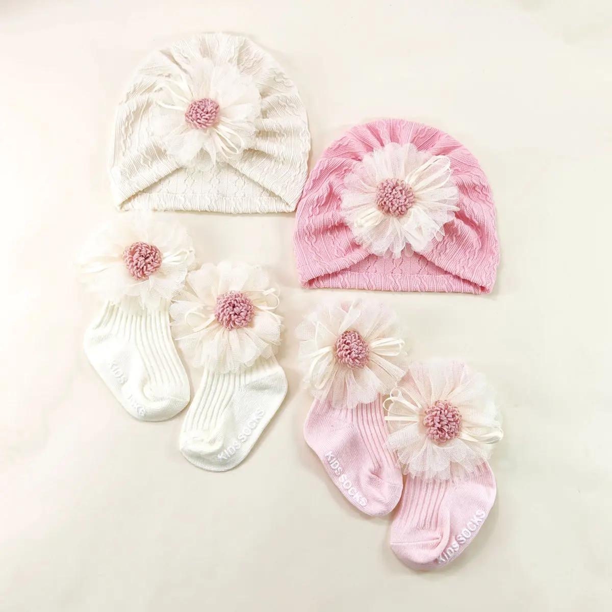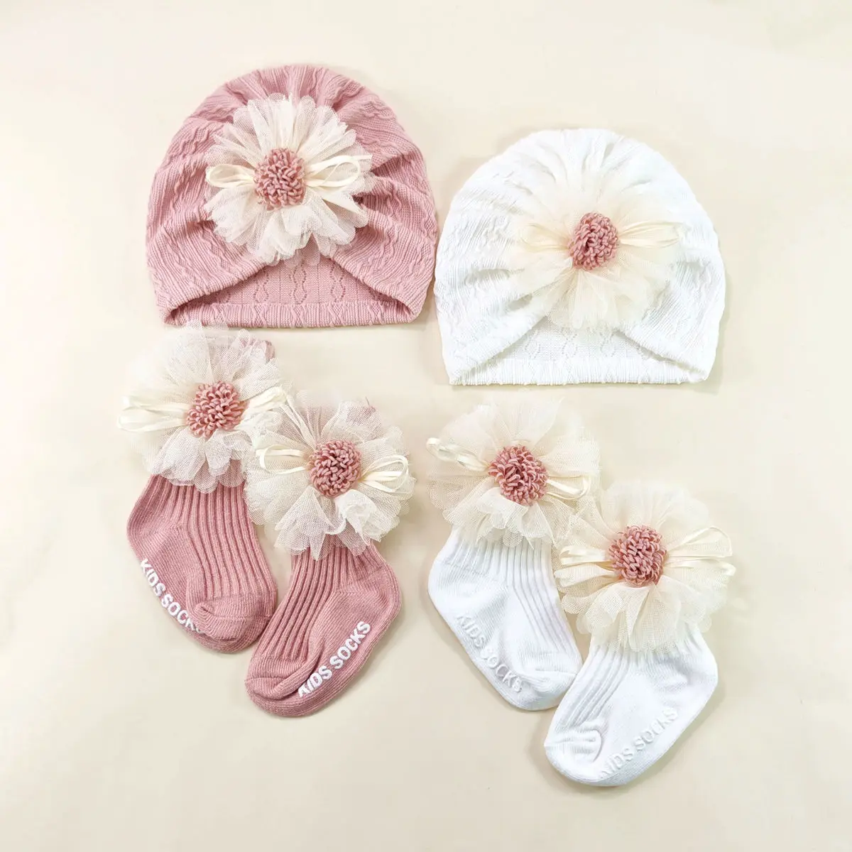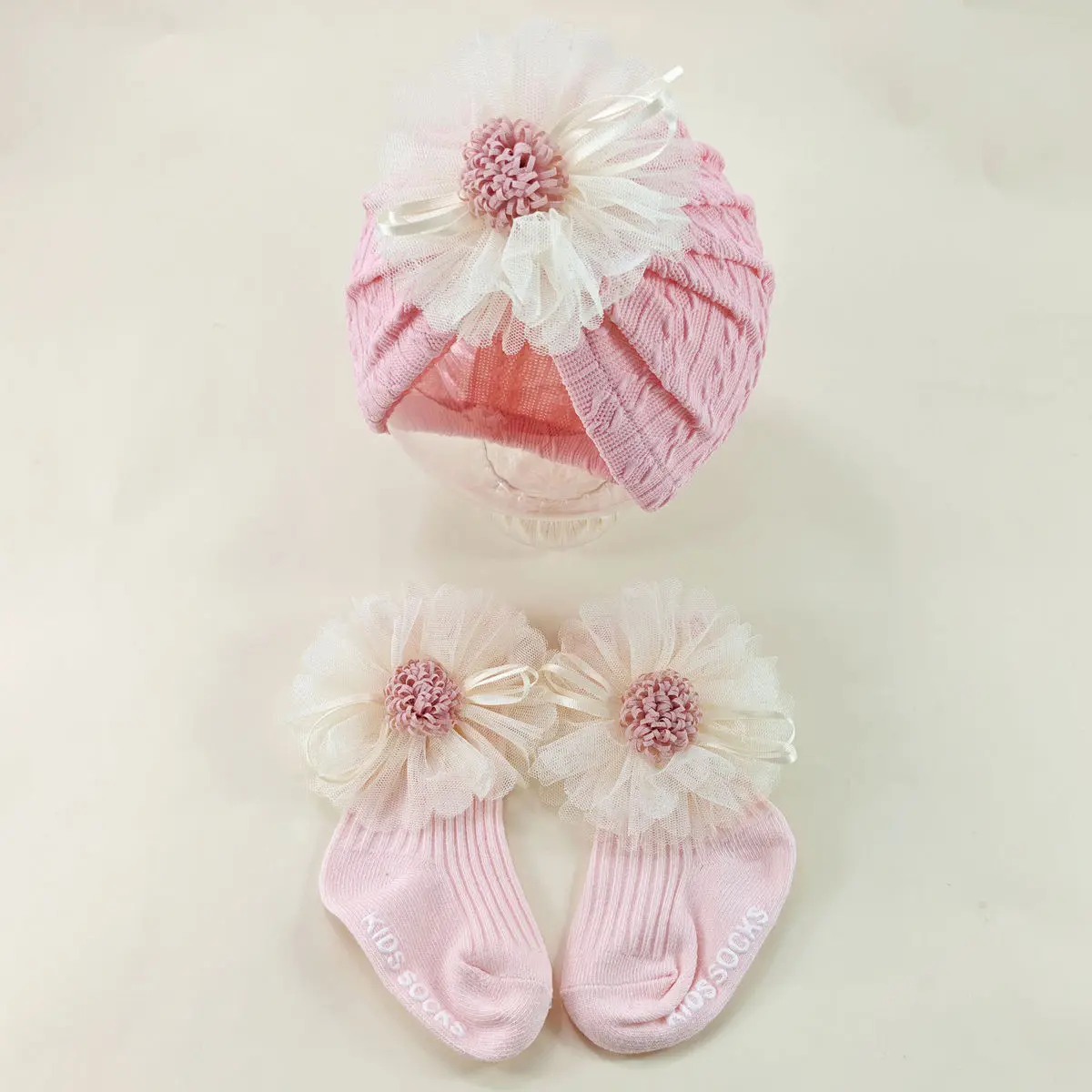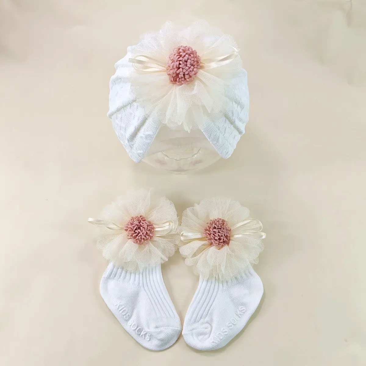 2pcs/set Newborn Elastic Turban Hat set Baby Girls Bow Cap Socks Set Baby Accessories Short Tube Sock Infant Indian CapsOne set: hat with socksAge;:about 0-9 monthsHat size: 17*16cmSocks size: 11+10cm