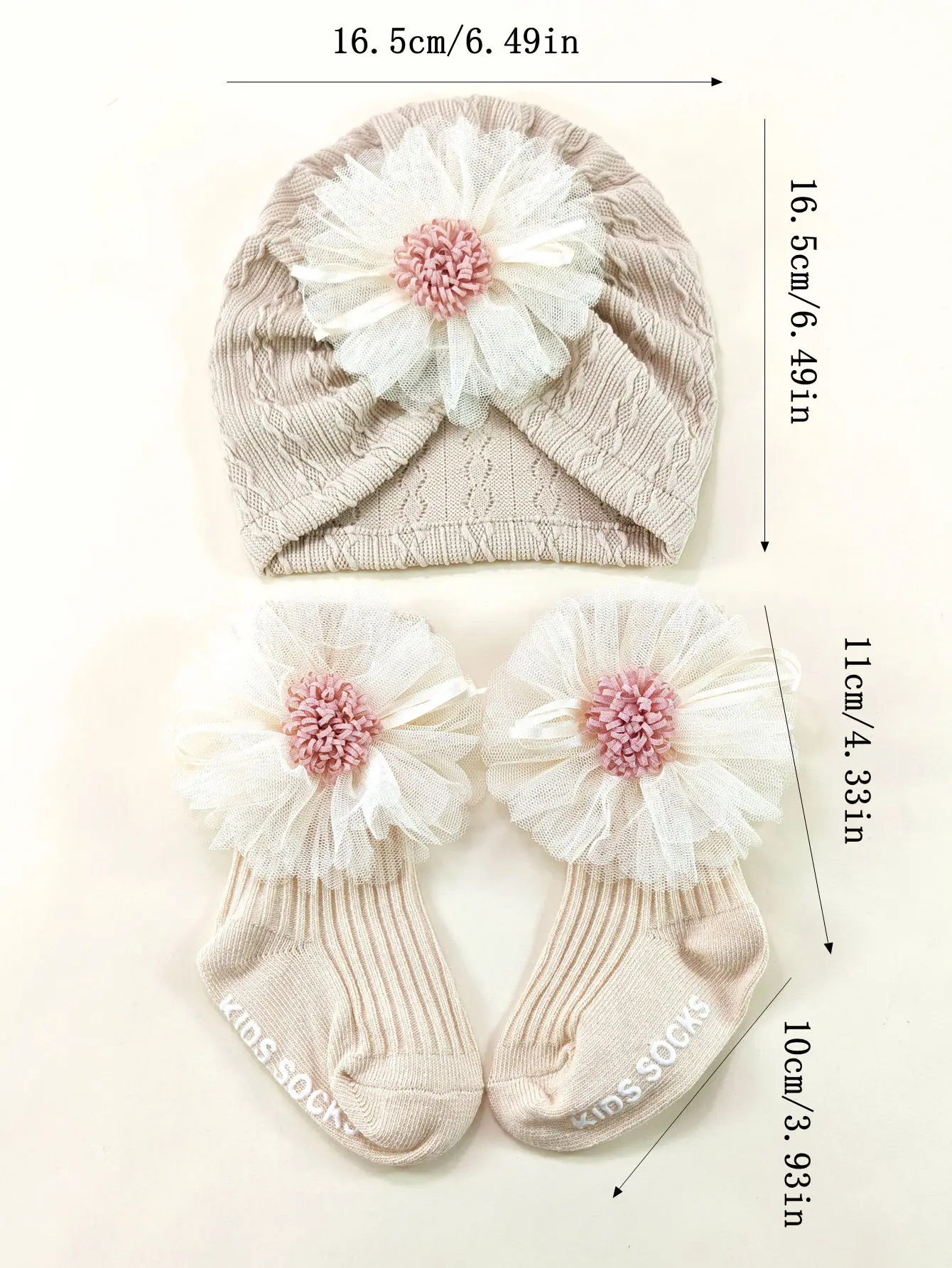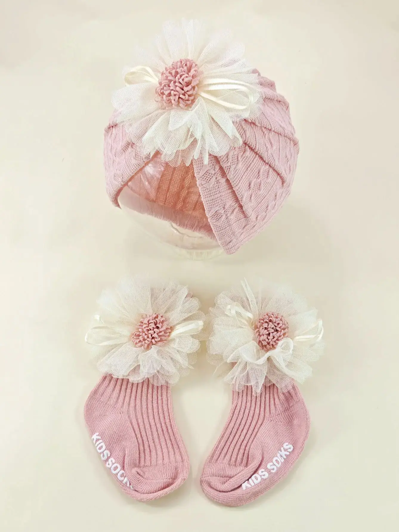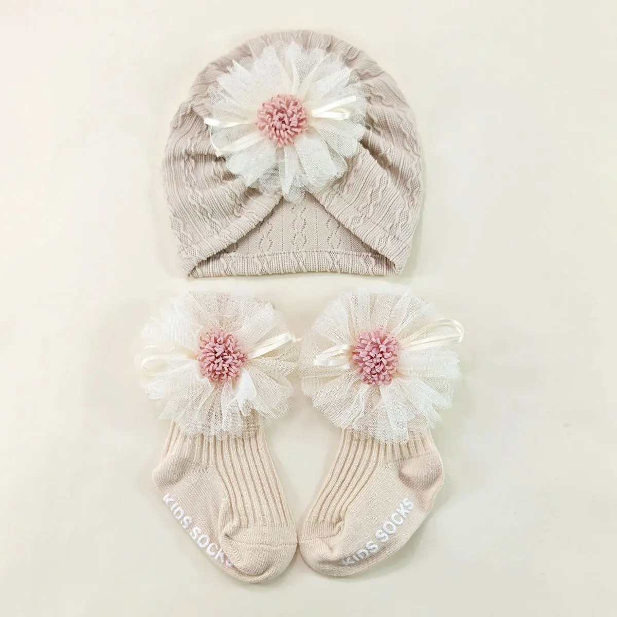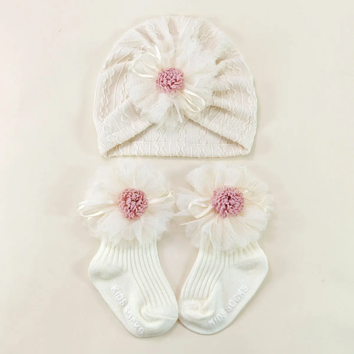 2pcs/set Newborn Elastic Turban Hat set Baby Girls Bow Cap Socks Set Baby Accessories Short Tube Sock Infant Indian CapsOne set: hat with socksAge;:about 0-9 monthsHat size: 17*16cmSocks size: 11+10cm