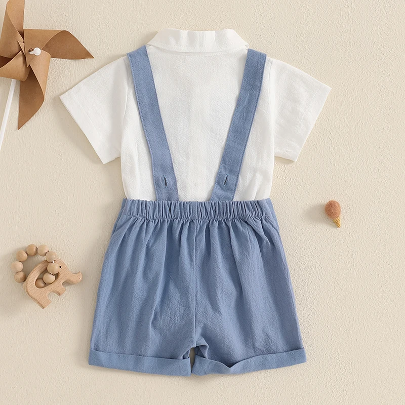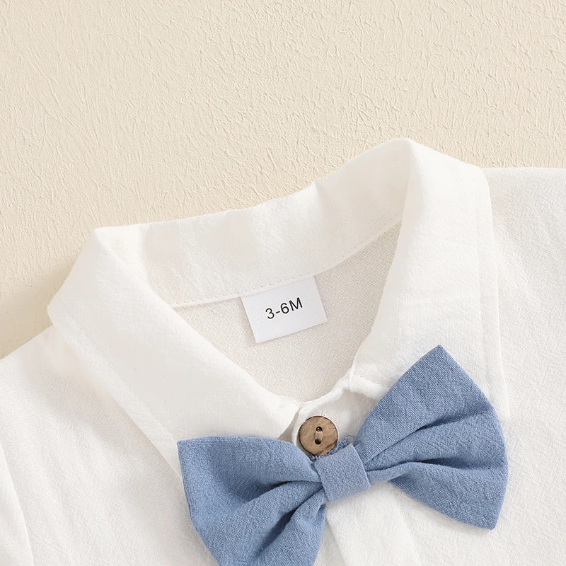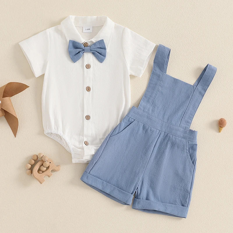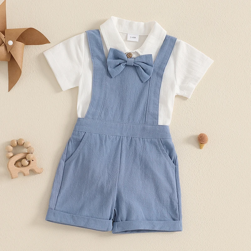 Baby Boy Gentleman Outfit Solid Color Short Sleeve Lapel Romper with Overalls Shorts and Bow Tie 3 Pcs Set