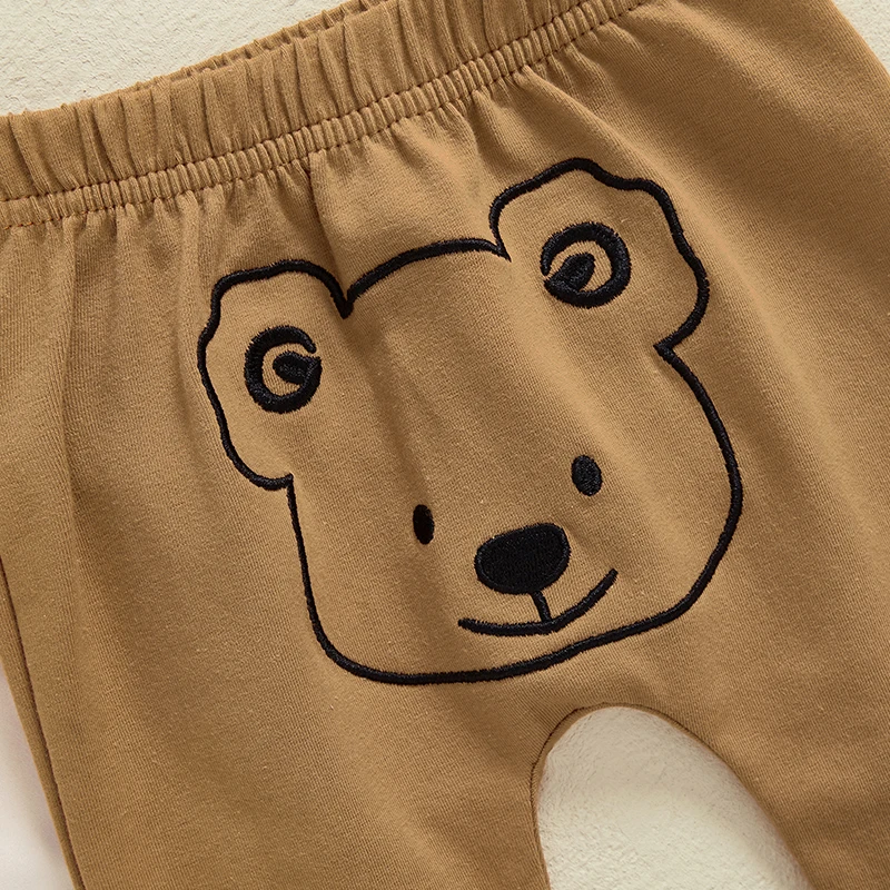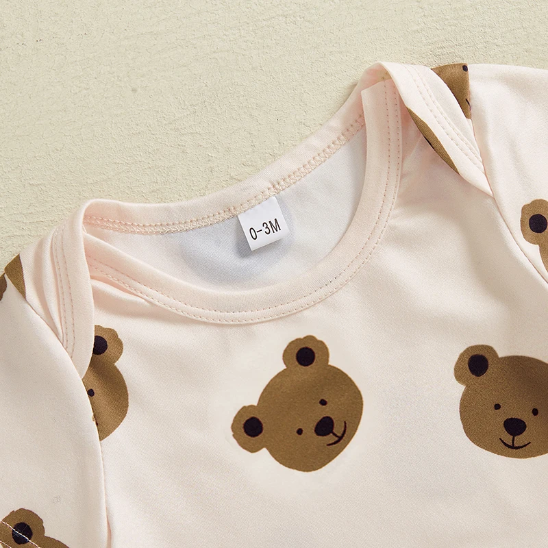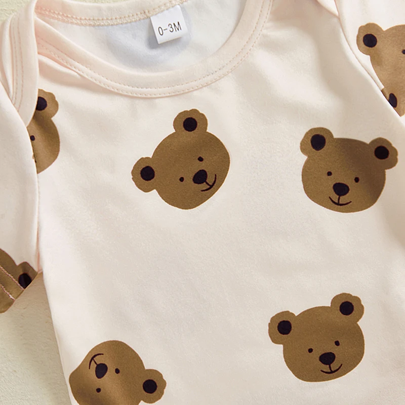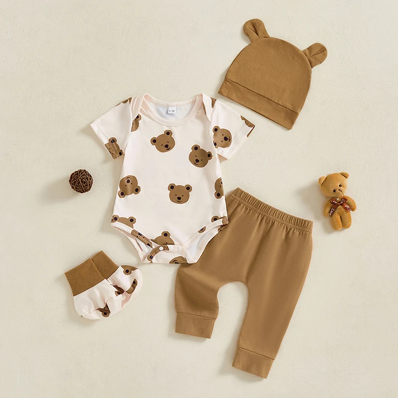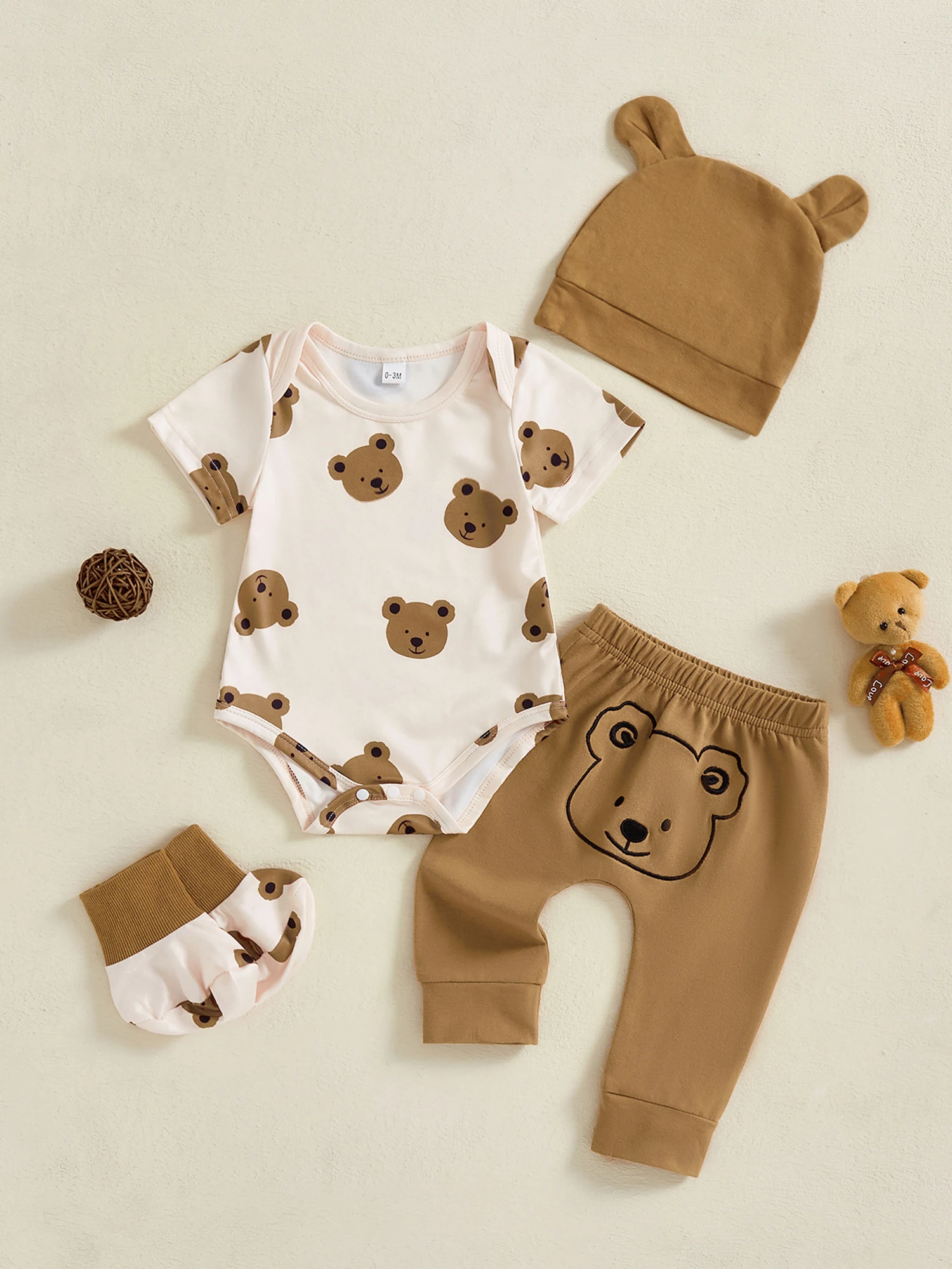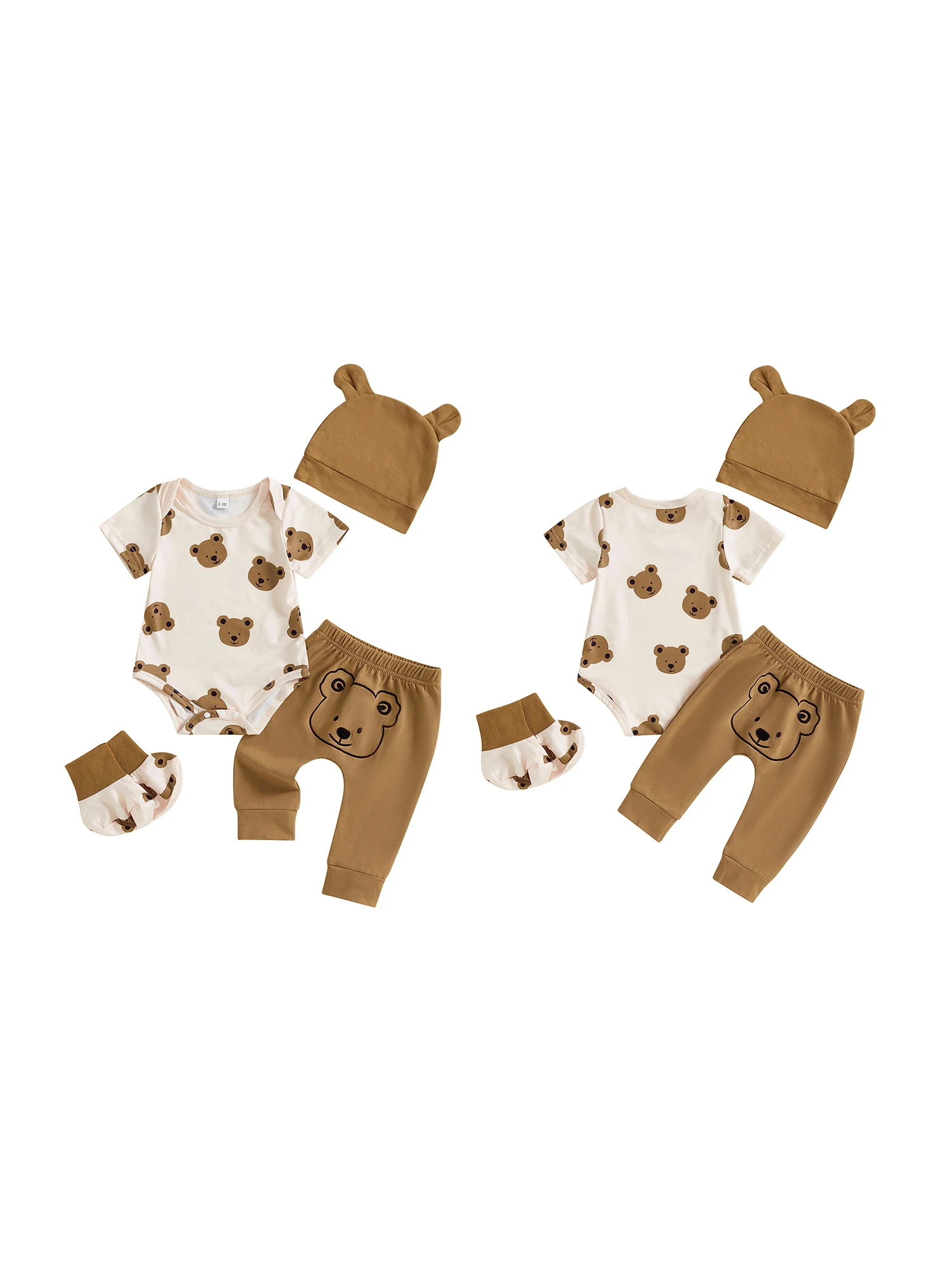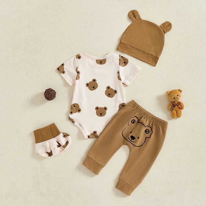 Baby Boy Summer Outfits Bear Print Short Sleeve Round Neck Romper with Pants and Hat Shoes Set