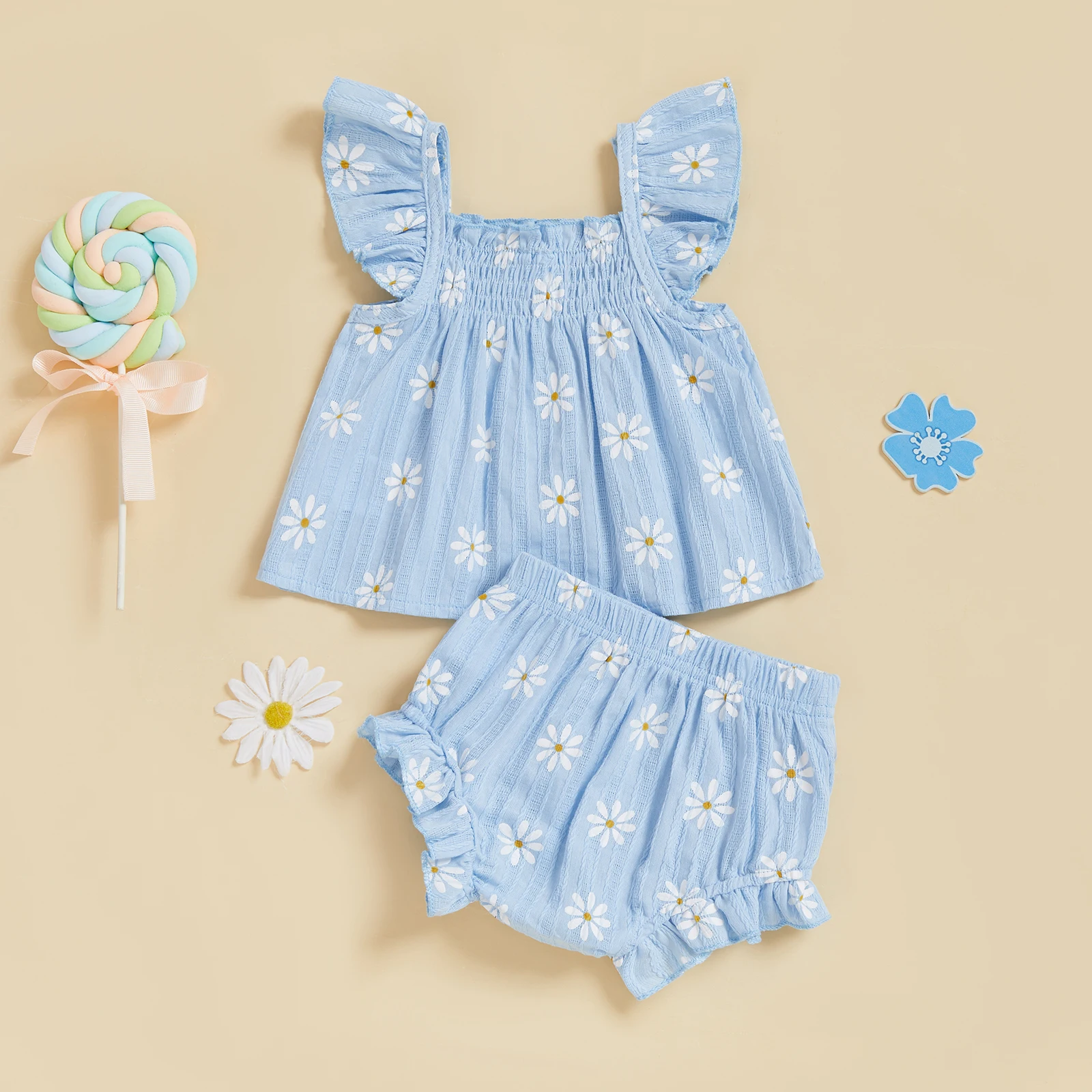 Baby Girl Daisy Outfit Smocked Flying Sleeve Babydoll Tops Elastic Waist Ruffle Shorts Cute Summer Clothes 2Pcs Set