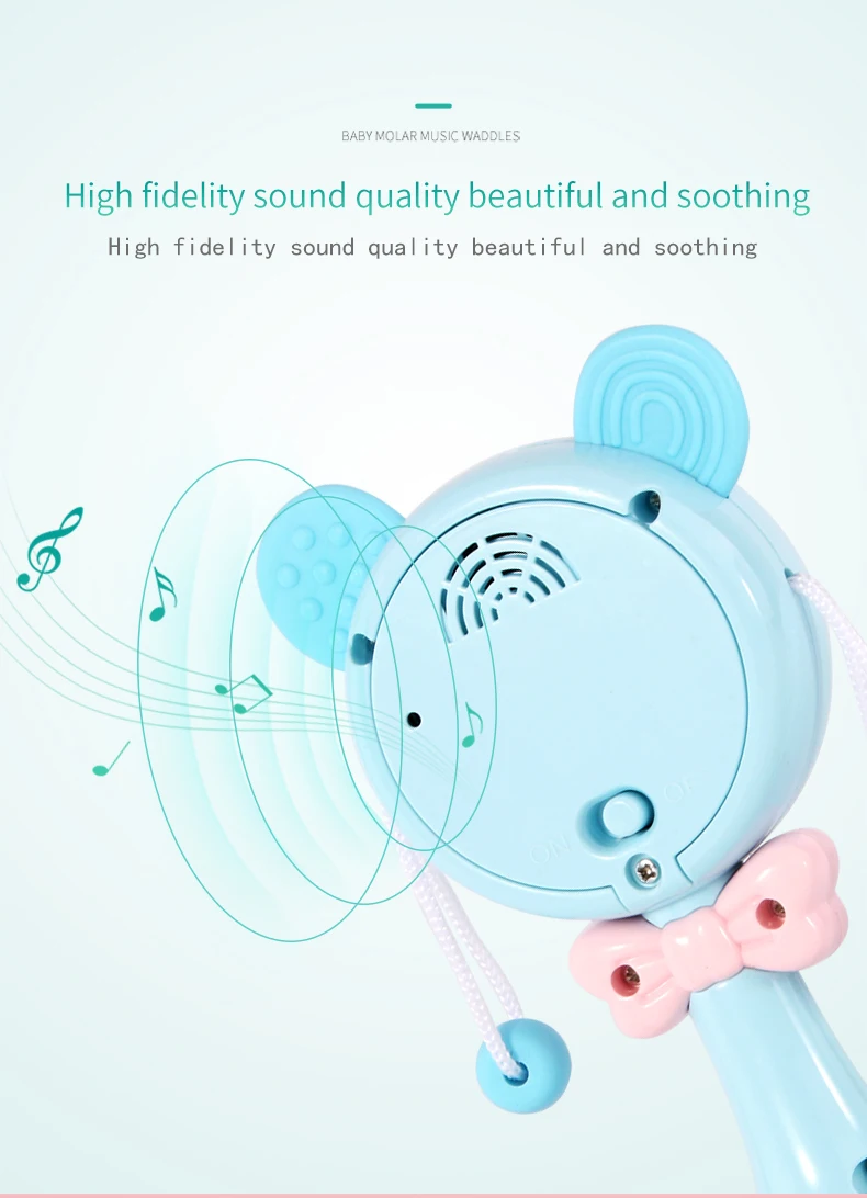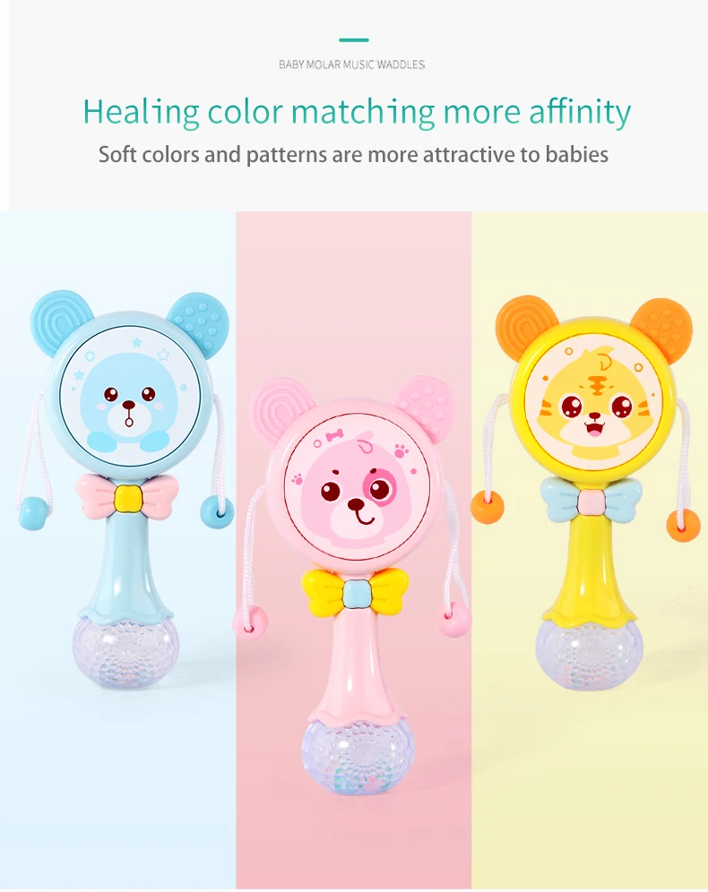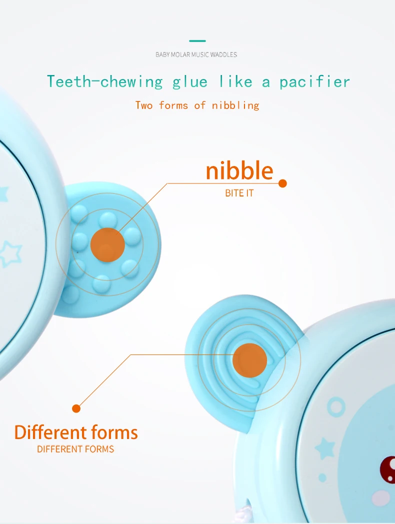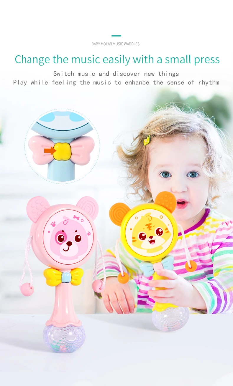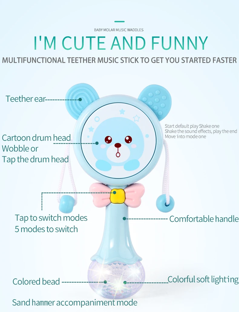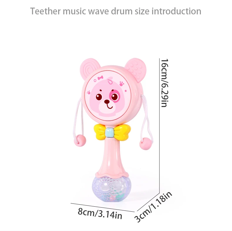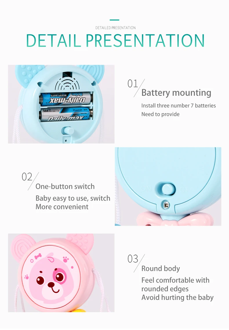 Notes1.Suitable battery: 2 x AA batteries(not included)2.Due to the different monitor and light effect, the actual color of the item might be slightly different from the color showed on the pictures. Thank you!3.Please allow 1-3cm measuring deviation due to manual measurement.Early childhood education puzzle.The ear with food grade silicone material can help teeth development.The smiling face light flashes.There are six music to option through the button with sand hammer accompaniment.The color beads and the music form an ensemble effect when shaking.Transparent ball lighting effect is conducive to the baby's vision.Colorful and soft lighting.Belly can be rotated.