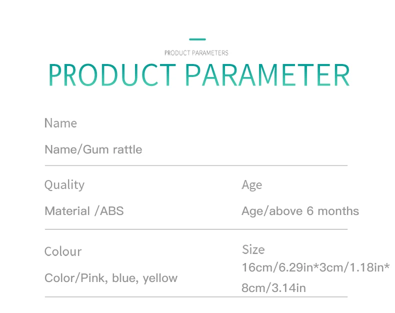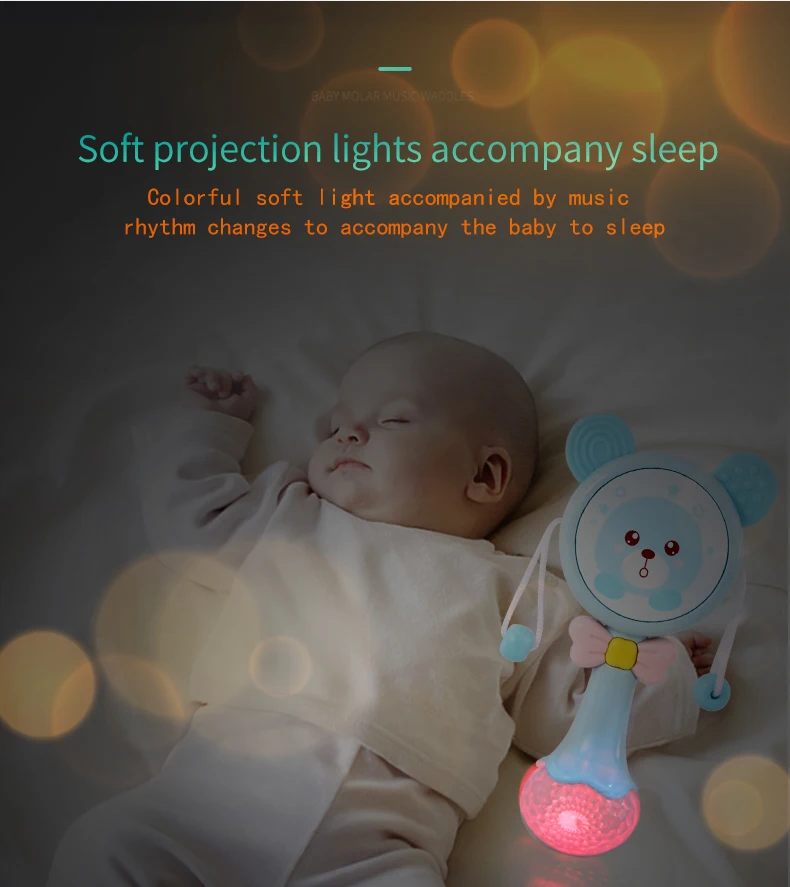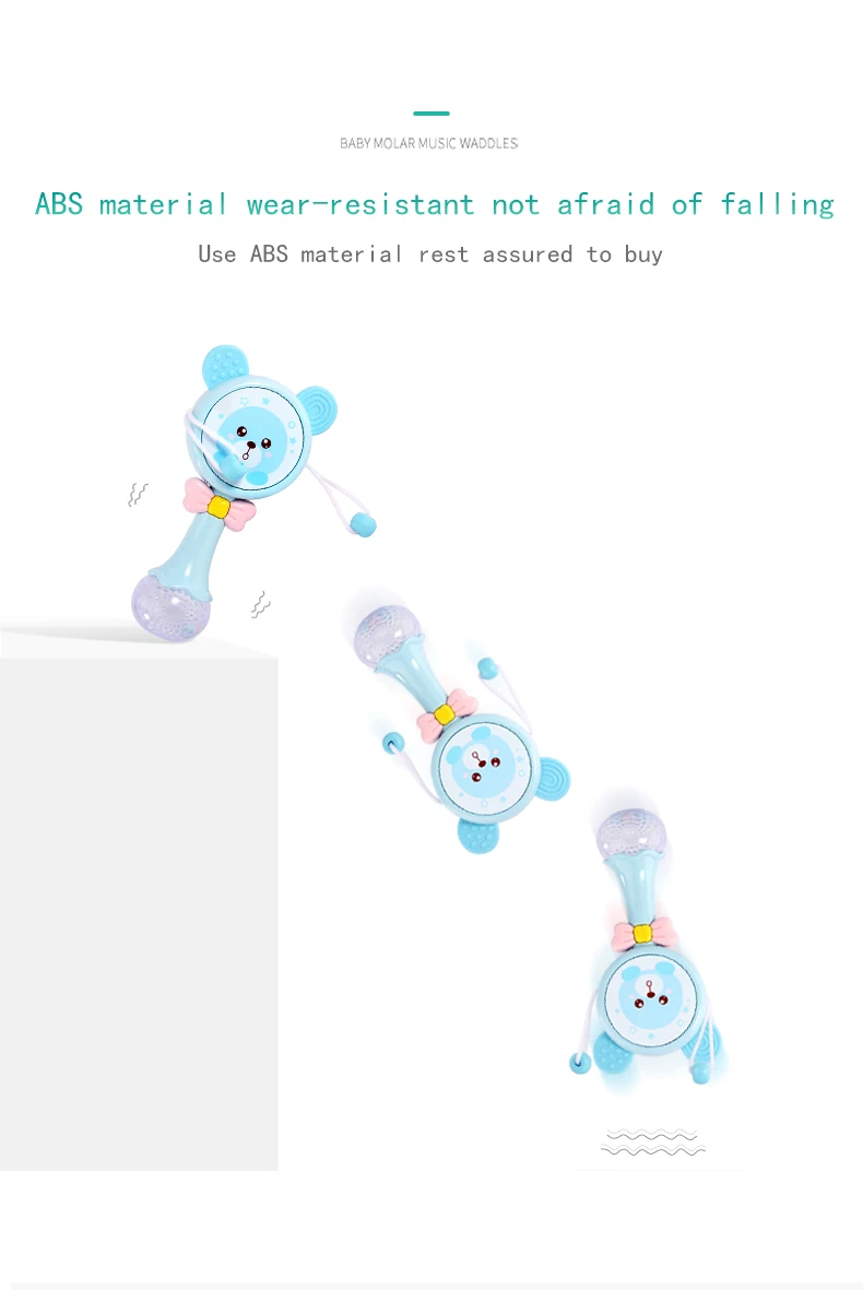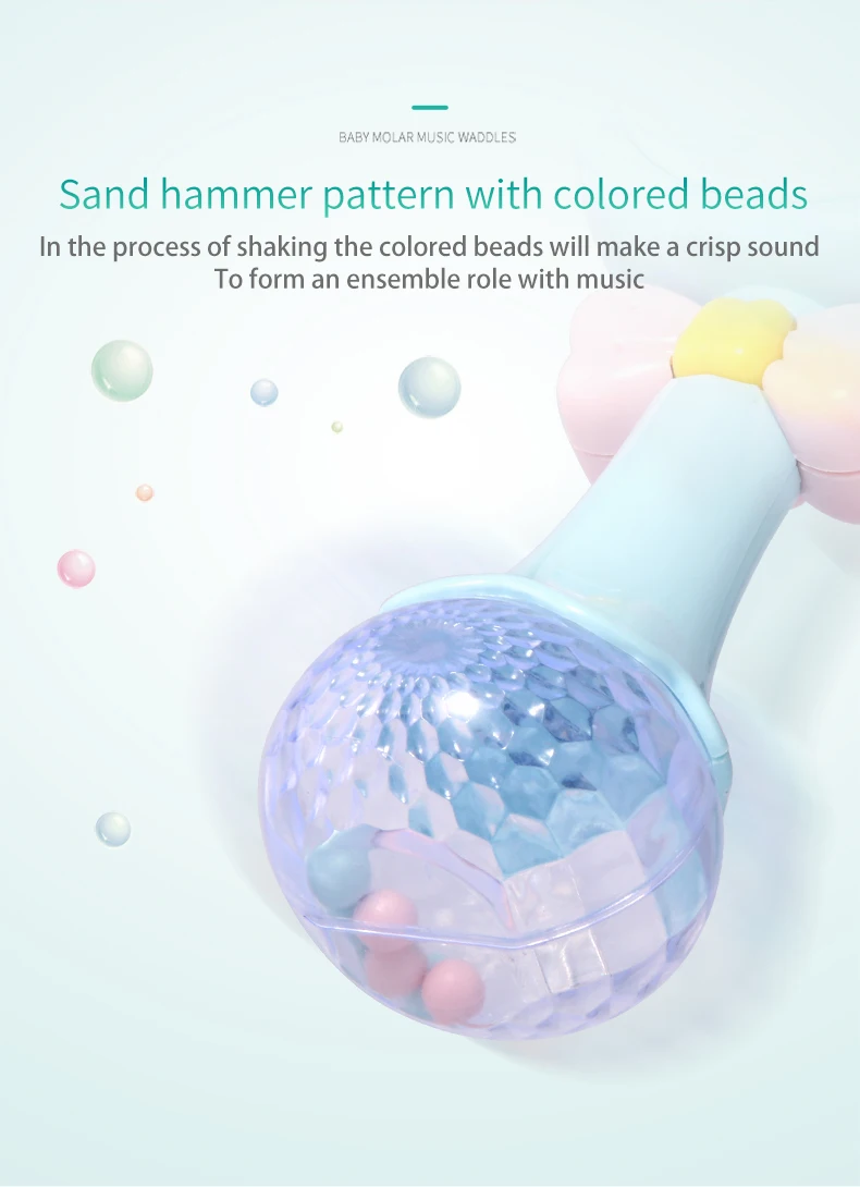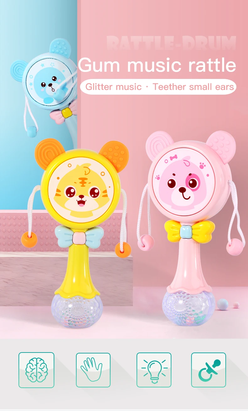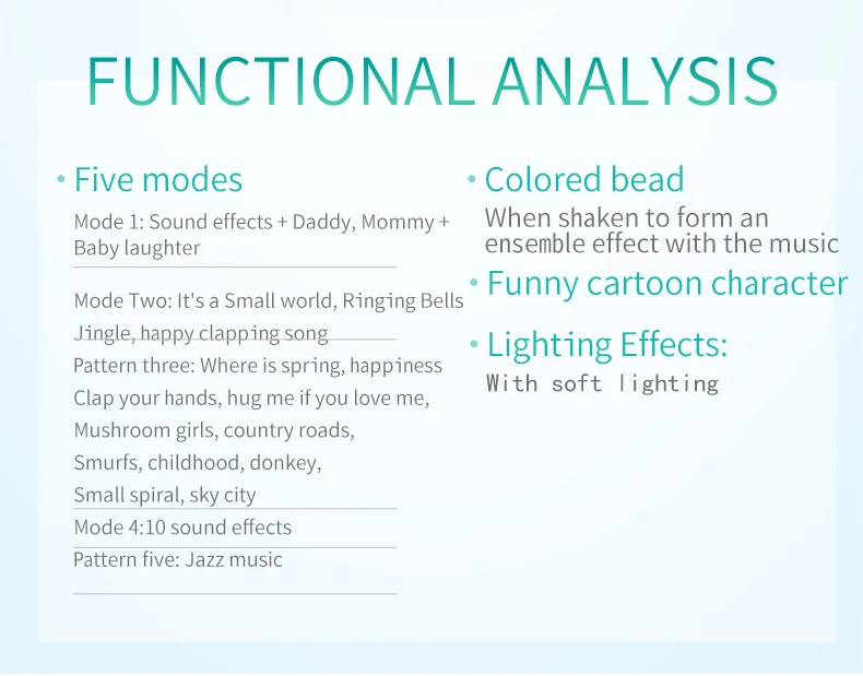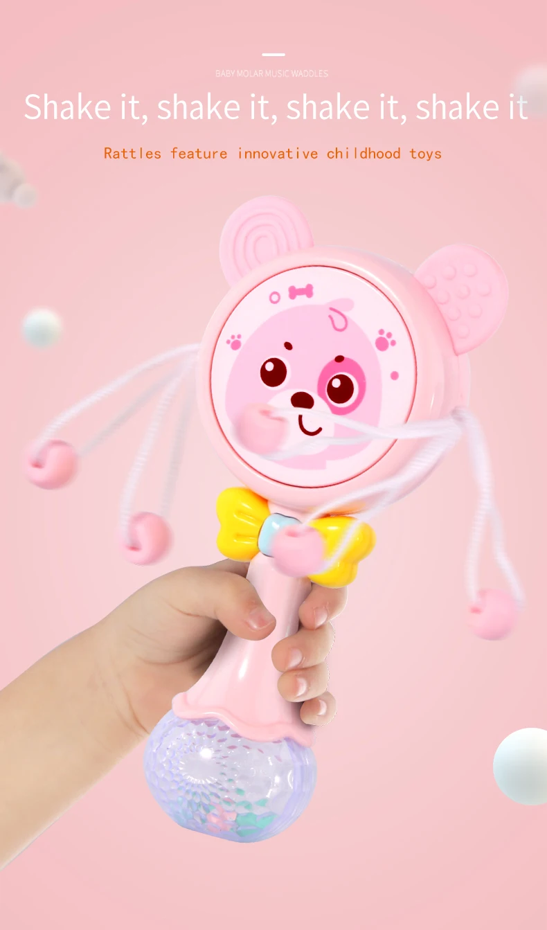 Notes1.Suitable battery: 2 x AA batteries(not included)2.Due to the different monitor and light effect, the actual color of the item might be slightly different from the color showed on the pictures. Thank you!3.Please allow 1-3cm measuring deviation due to manual measurement.Early childhood education puzzle.The ear with food grade silicone material can help teeth development.The smiling face light flashes.There are six music to option through the button with sand hammer accompaniment.The color beads and the music form an ensemble effect when shaking.Transparent ball lighting effect is conducive to the baby's vision.Colorful and soft lighting.Belly can be rotated.