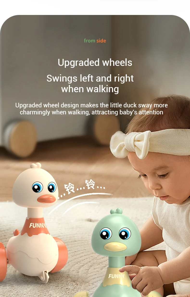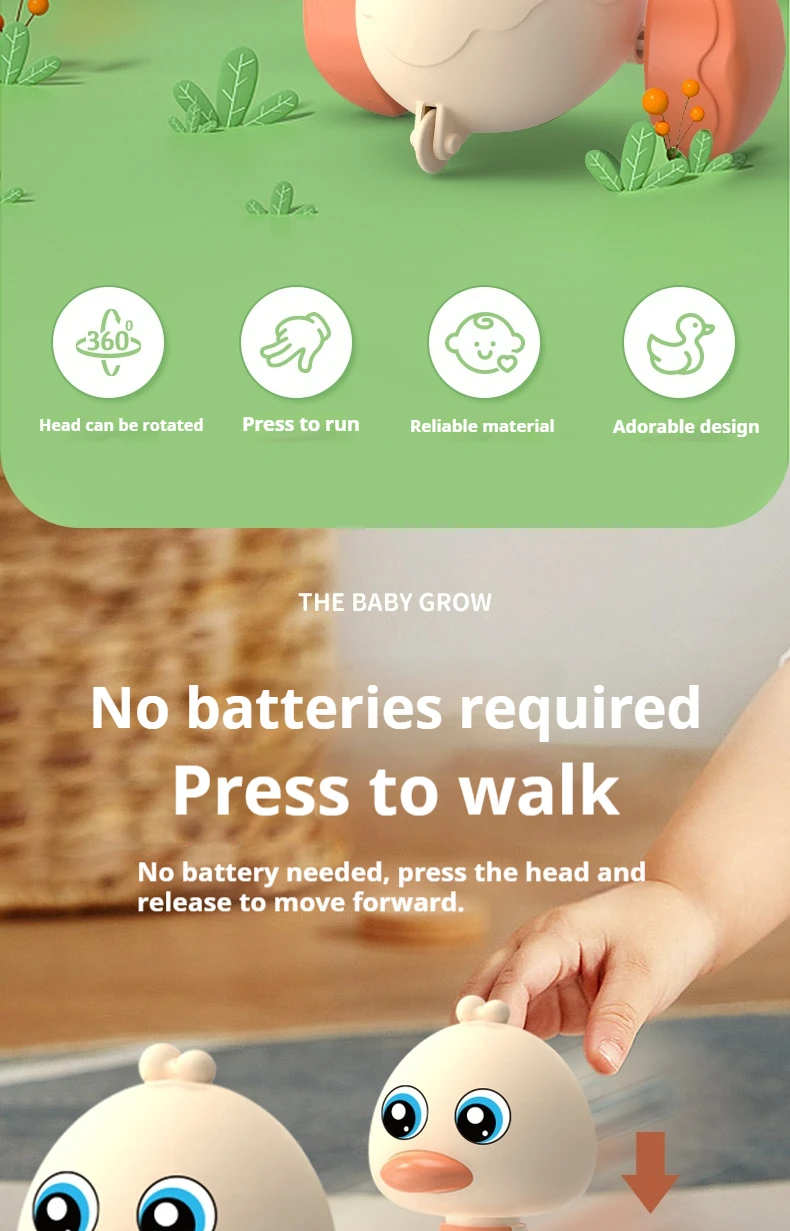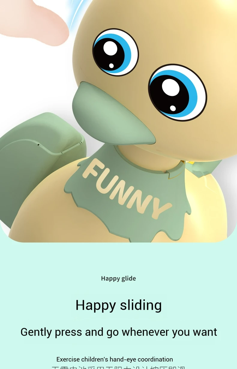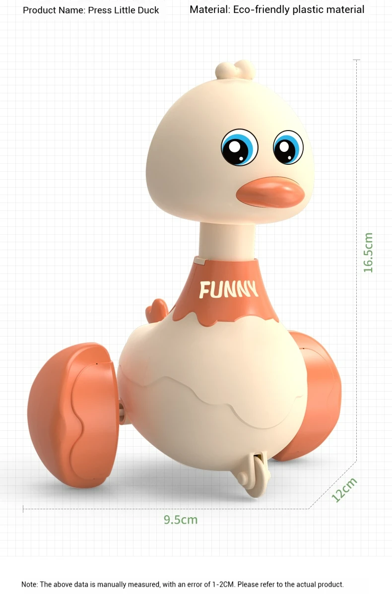 Description:Product Name: Pressure Swing Duck ToyColor: Green/Yellow/Light RedSize:9.5x12x16.5cmApplicable age: 18M+Material: ABSPackaging includes: 1x DuckPackaging:BoxFeatures:Boost your child's development with our Pull Back Duck Car! This engaging toy is designed to support early learning while delivering endless fun. Through interactive play, kids enhance hand-eye coordination, spark imagination, encourage creativity, refine fine motor skills, and improve concentration—all while enjoying themselves!Crafted from high-quality ABS material, this duck car is lightweight, impact-resistant, and extremely durable. Its shatter-proof design features smooth edges without any burrs, making it safe for little hands to grip, play, and explore with complete confidence.The bright and cheerful colors of the toy car promote color recognition and help develop visual perception in young children. It’s not just a toy—it’s a fun way to learn!Operating the duck car is simple and hassle-free. Just press the button on top, pull it back, and watch it wobble cutely and zoom forward on its own! No batteries are needed, making it ready for play anytime, anywhere.Ideal for toddlers and preschoolers, this pull-back car is a great gift for both everyday fun and educational play.