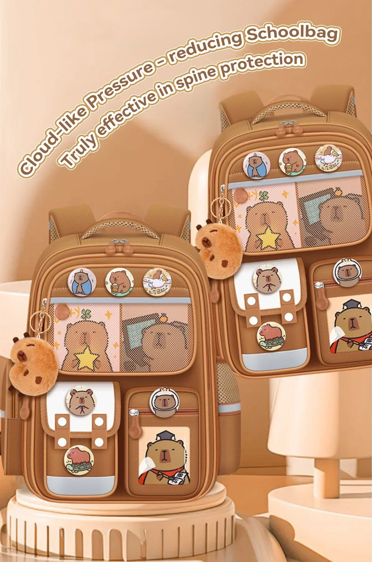 Brand New and High Quality!Product Name: Capybara BackpackMaterial: Oxford clothMaterial of lining: PolyesterColor: As the Picture ShownSize: S,LApplicable User: StudentsApplicable scenario: School educationCarrying System: Curved Shoulder StrapFeatures:1. High-Quality Oxford Fabric: Made from durable and water-resistant Oxford fabric, this capybara backpack ensures long-lasting use and protects your belongings from the elements.2. Spacious and Organized Storage: Featuring a large capacity with multiple compartments, this backpack offers ample space for all your essentials and keeps every-thing neatly organized and easily accessible.3. Polyester Lining: The interior is lined with high-quality polyester, adding an extra layer of durability and ensuring your items are well-protected and securely stored.4. Ergonomic Comfort: Designed with widened shoulder straps to evenly distribute weight, this backpack reduces strain on your shoulders and helps protect your spine. The back panel is cushioned with rebound foam for enhanced comfort during extended wear.5. Complete Accessory Set: This backpack set includes one capybara-themed backpack, 3 cards, 6 badges, and 1 plush doll, making it a fun and practical choice for students who want to showcase their unique style and personality.Package Includes:1pc * Backpack3pcs * card6pcs * badge1pcs * dollNote:1. Due to the different monitor and light effect, the actual color of the item might be slightly different from the color showed on the pictures.2. Please allow 1-3cm(0.39-1.18in) measuring deviation due to manual measurement.