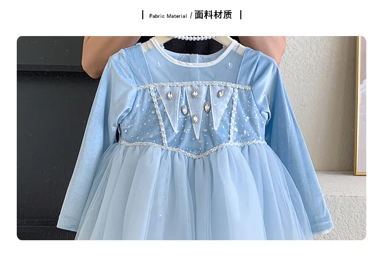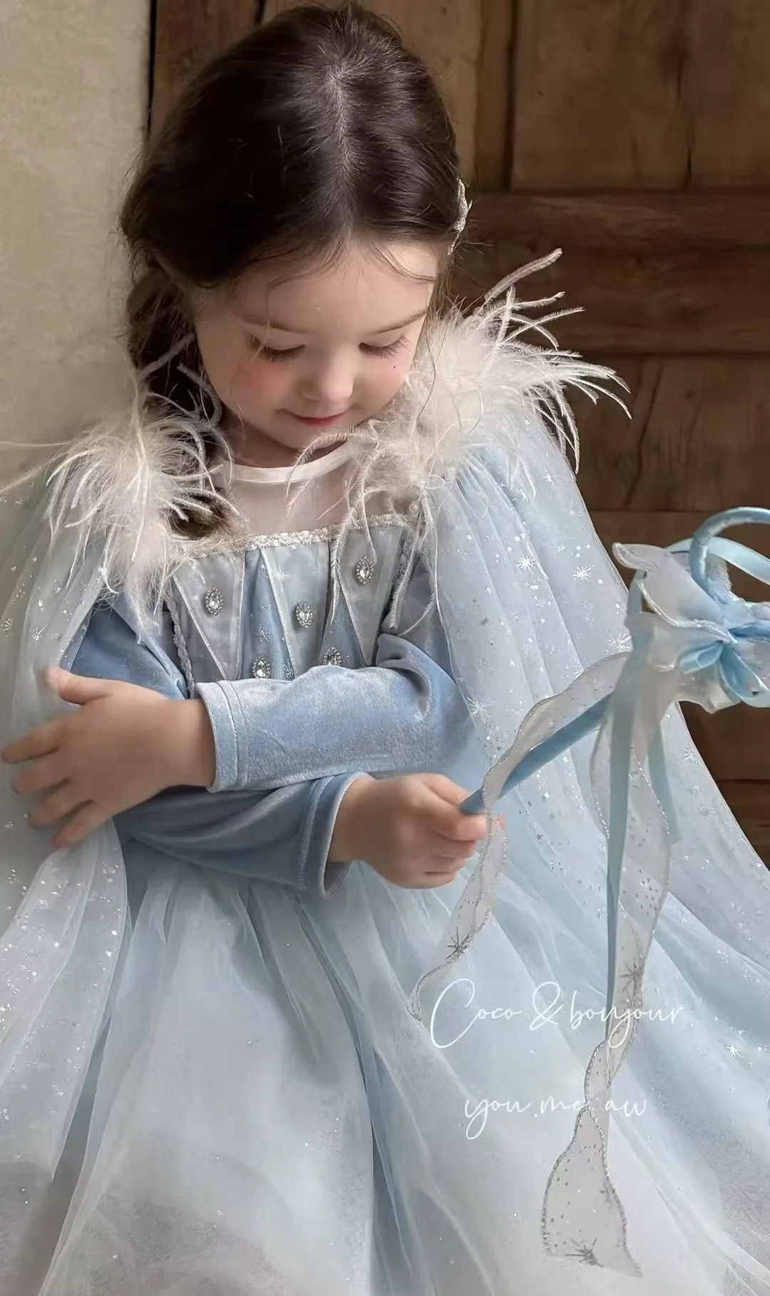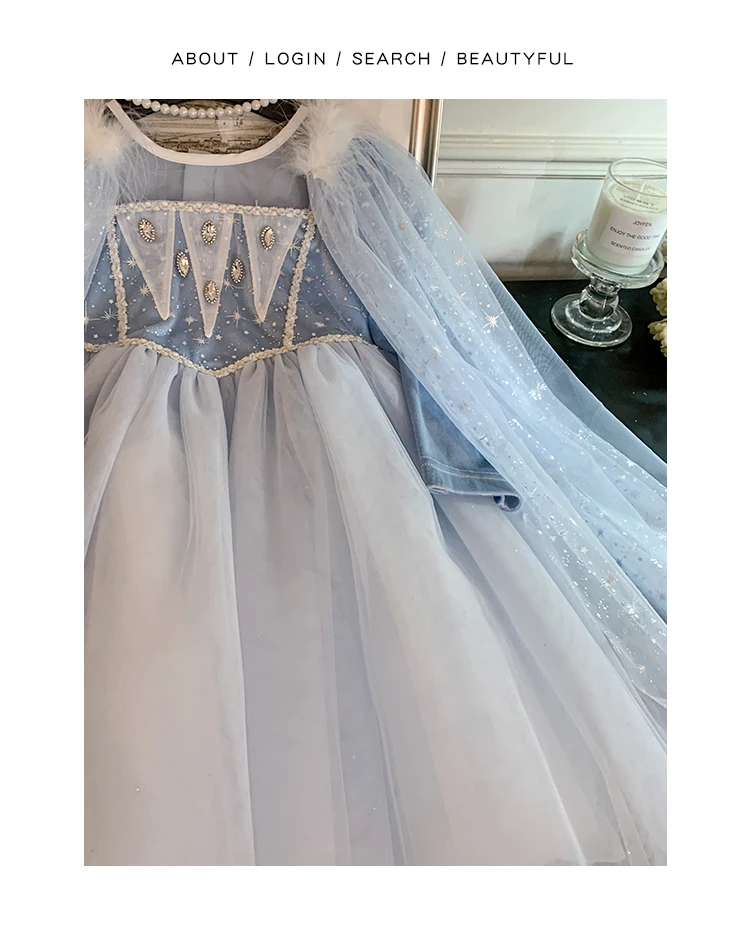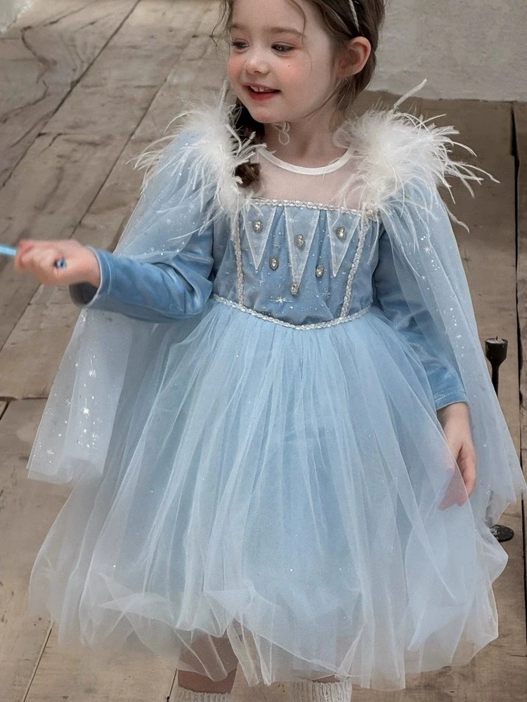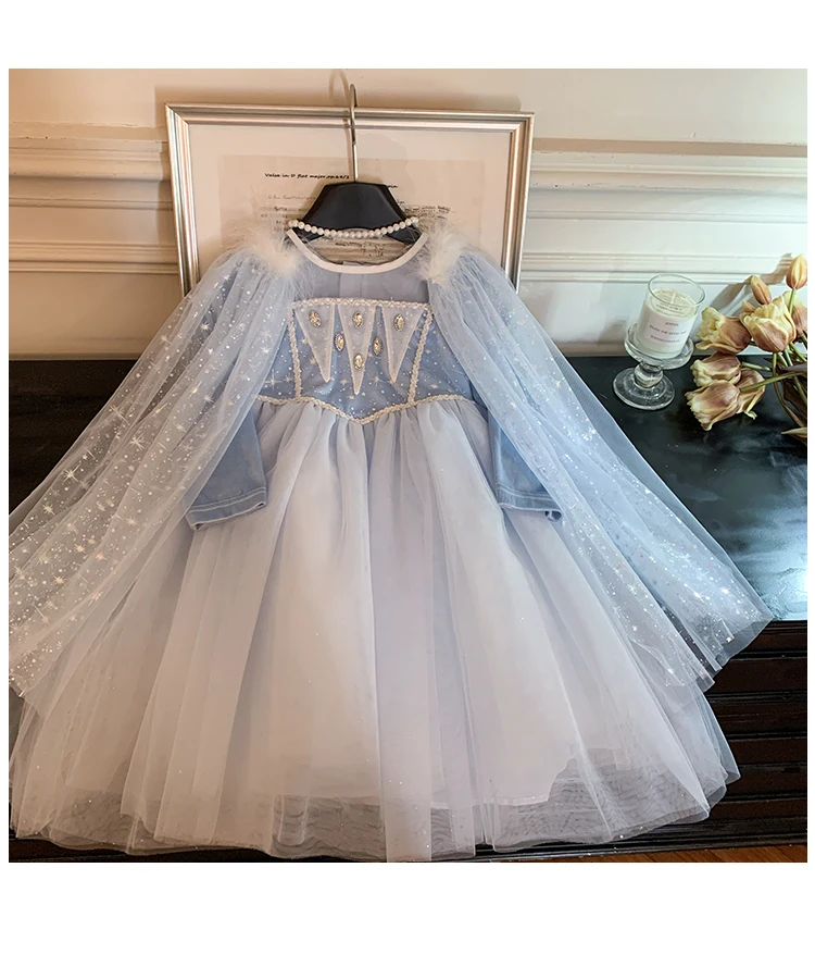 Product Description:✨ Enchanting Elsa Design: This stunning light blue velvet dress features sparkling gold star and snowflake sequins on the bodice and tulle, perfectly capturing the magical Frozen princess fantasy.Luxurious & Comfortable: Premium velvet exterior paired with soft 100% cotton lining throughout the bodice and skirt ensures warmth and comfort for all-day wear during autumn, winter, or spring.Dramatic Detachable Cape: Includes a matching light blue tulle cape with faux fur trim and gold sequin details, easily removable to create two distinct looks – simple elegance or full royal grandeur.Exquisite Handcrafted Details: Adorned with a shimmering star-shaped embroidered tulle appliqué on the chest, accented with 6 sparkling gemstones for added brilliance and luxury.Versatile Seasonal Wear: Ideal for birthday parties, costume events, Christmas celebrations, or imaginative daily play, available in sizes 90-150 to fit girls from 18 months to 11 years old.1.Because of