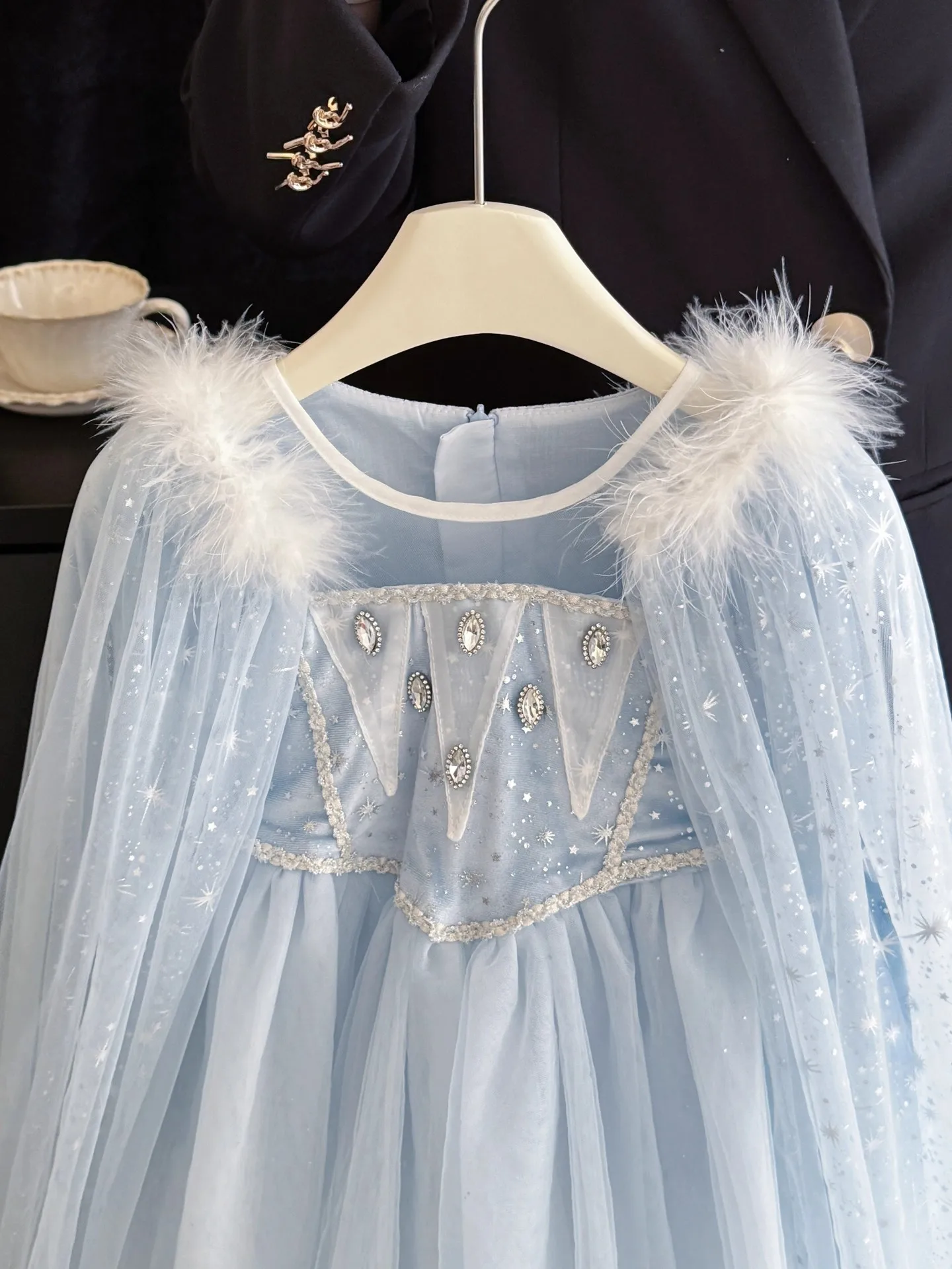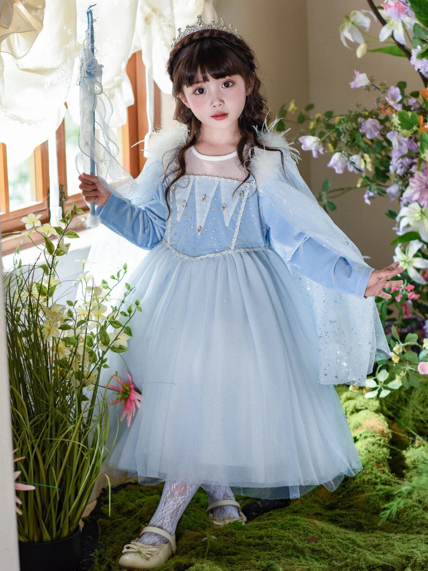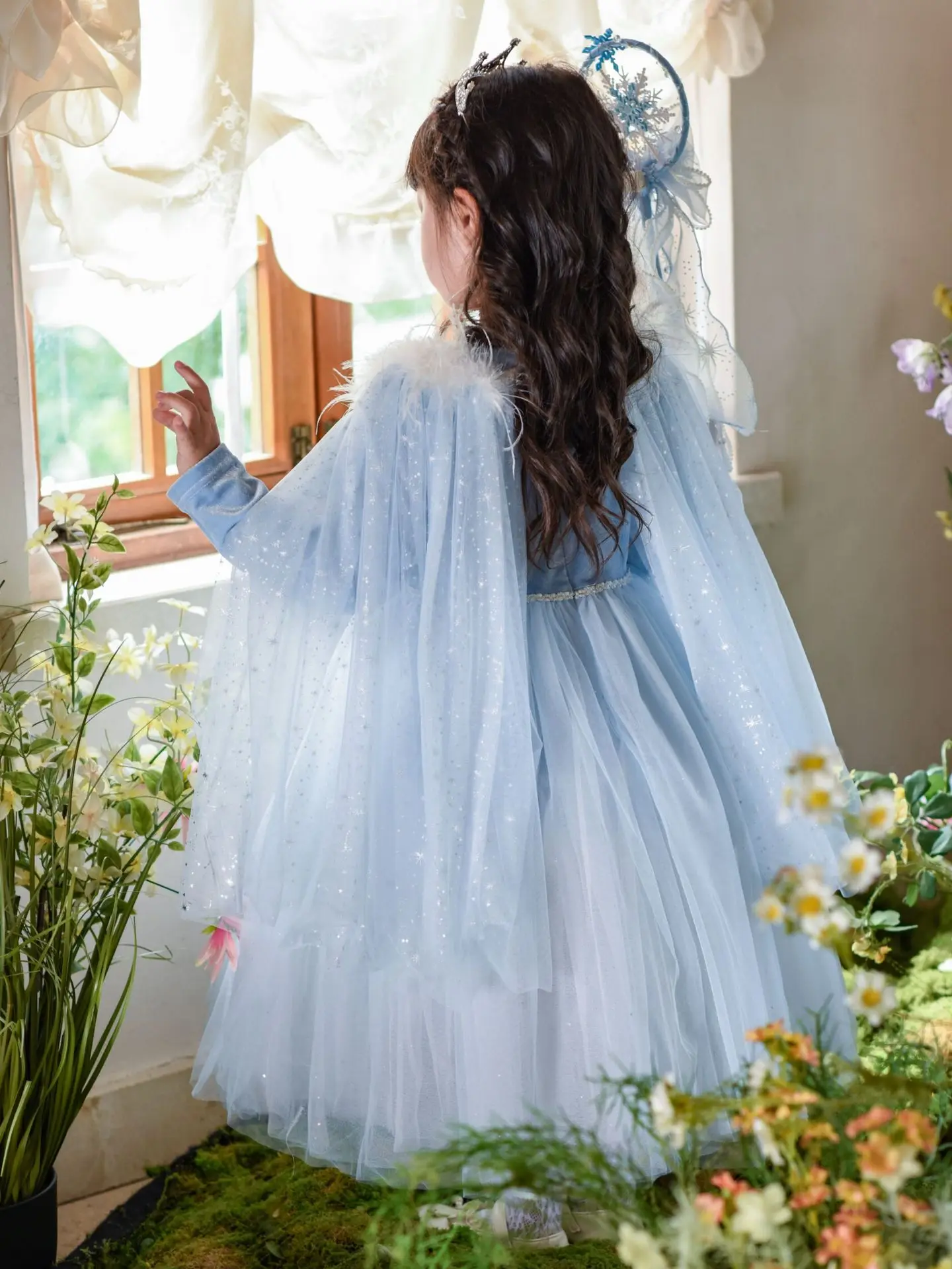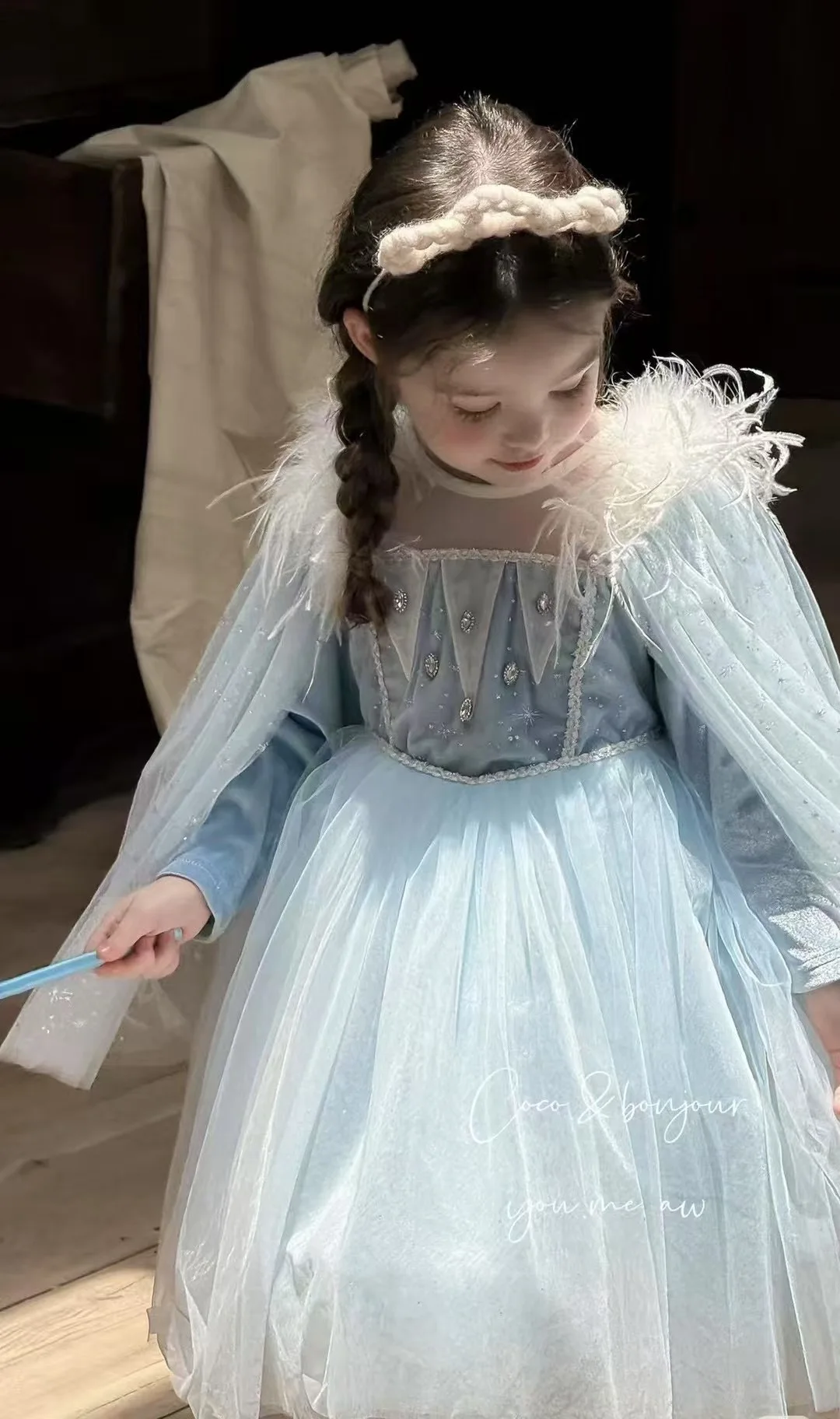 Product Description:✨ Enchanting Elsa Design: This stunning light blue velvet dress features sparkling gold star and snowflake sequins on the bodice and tulle, perfectly capturing the magical Frozen princess fantasy.Luxurious & Comfortable: Premium velvet exterior paired with soft 100% cotton lining throughout the bodice and skirt ensures warmth and comfort for all-day wear during autumn, winter, or spring.Dramatic Detachable Cape: Includes a matching light blue tulle cape with faux fur trim and gold sequin details, easily removable to create two distinct looks – simple elegance or full royal grandeur.Exquisite Handcrafted Details: Adorned with a shimmering star-shaped embroidered tulle appliqué on the chest, accented with 6 sparkling gemstones for added brilliance and luxury.Versatile Seasonal Wear: Ideal for birthday parties, costume events, Christmas celebrations, or imaginative daily play, available in sizes 90-150 to fit girls from 18 months to 11 years old.1.Because of