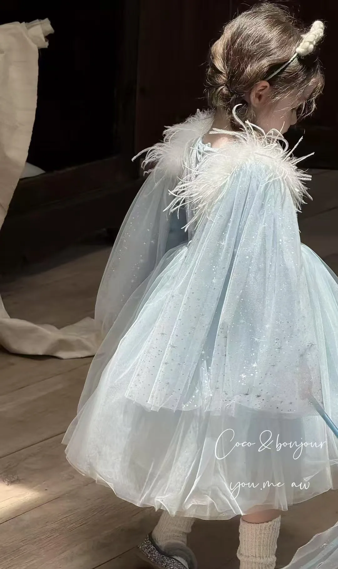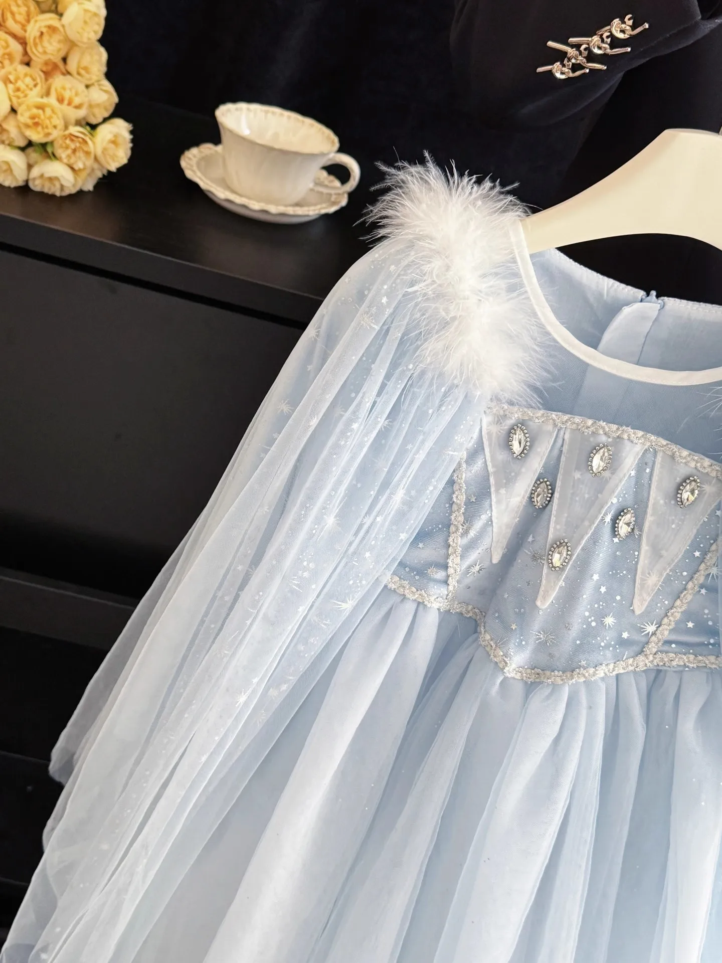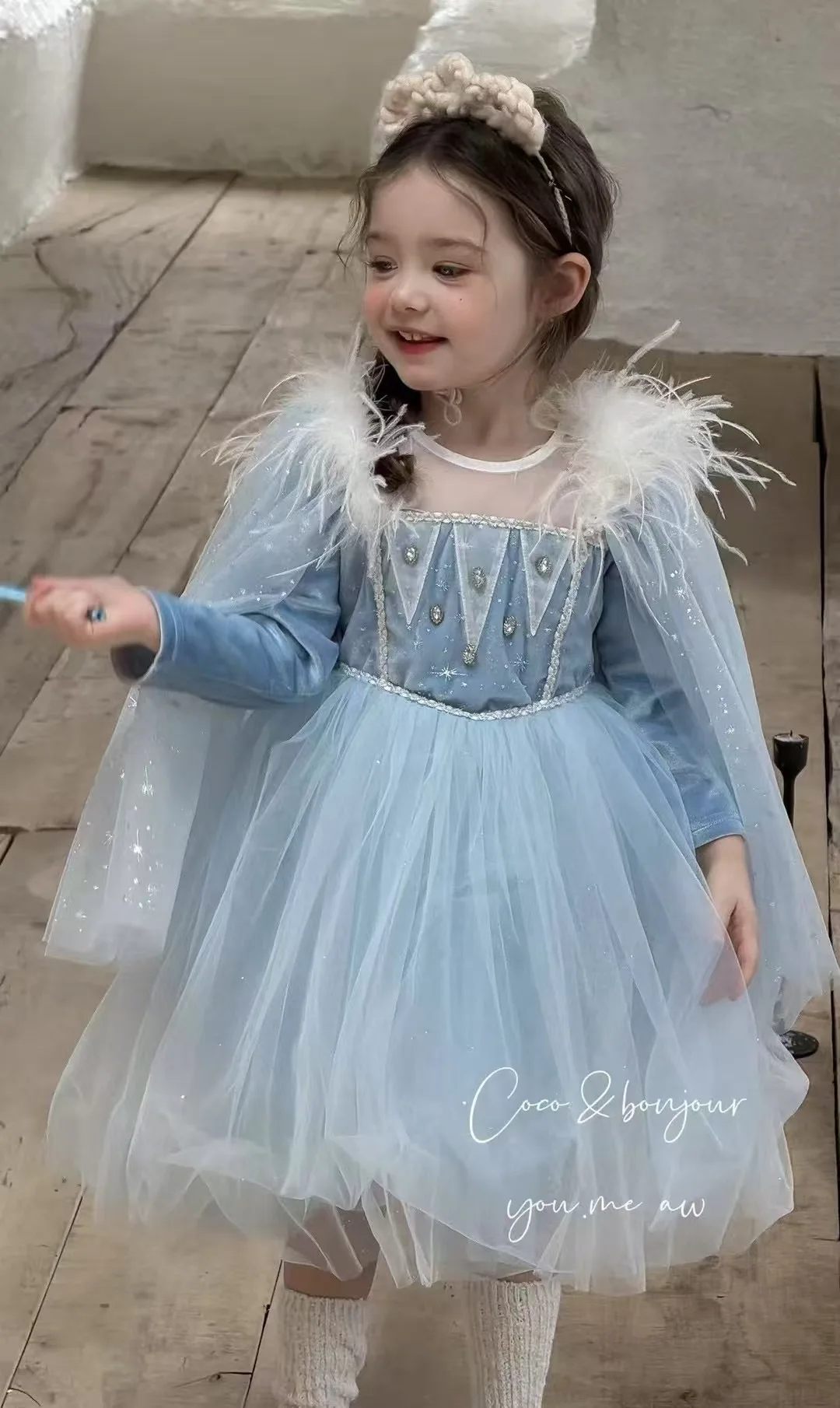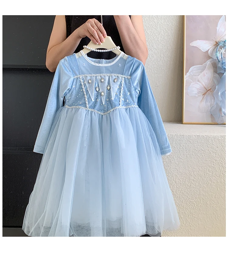 Product Description:✨ Enchanting Elsa Design: This stunning light blue velvet dress features sparkling gold star and snowflake sequins on the bodice and tulle, perfectly capturing the magical Frozen princess fantasy.Luxurious & Comfortable: Premium velvet exterior paired with soft 100% cotton lining throughout the bodice and skirt ensures warmth and comfort for all-day wear during autumn, winter, or spring.Dramatic Detachable Cape: Includes a matching light blue tulle cape with faux fur trim and gold sequin details, easily removable to create two distinct looks – simple elegance or full royal grandeur.Exquisite Handcrafted Details: Adorned with a shimmering star-shaped embroidered tulle appliqué on the chest, accented with 6 sparkling gemstones for added brilliance and luxury.Versatile Seasonal Wear: Ideal for birthday parties, costume events, Christmas celebrations, or imaginative daily play, available in sizes 90-150 to fit girls from 18 months to 11 years old.1.Because of
