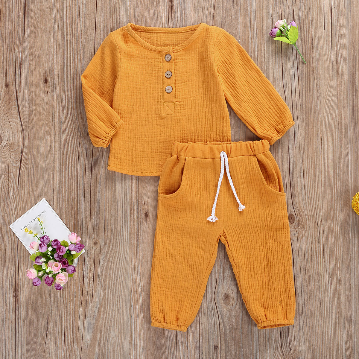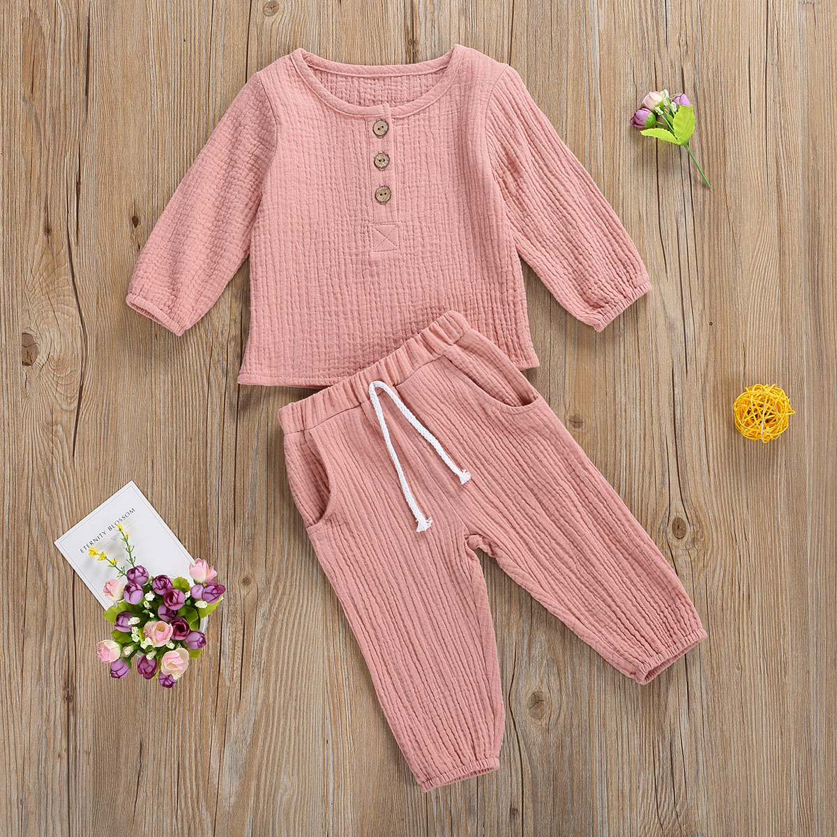Baby Suit – Delicate clipping and fine patchwork, the classical set can match any accessories Features:Special design, long sleeve and round collar shirt, with loose style for fall Light, soft, breathable cotton materialDelicate clipping and fine patchwork, the classical suit can match any accessories to make changeable appearanceSuitable for many occasions, great for party, birthday party, holiday, beach, photo shooting, daily wear.Size(cm) 80 Top Length: 34 Bust: 52 Pant Length: 40 Sleeve: 26.5 Waist: 40 Age: 6-12 Months90 Top Length: 36 Bust: 55 Pant Length: 43 Sleeve: 28.5 Waist: 42 Age: 12-24 Months100 Top Length: 38 Bust: 58 Pant Length: 46 Sleeve: 30.5 Waist: 44 Age: 2-3 Years110 Top Length: 40 Bust: 61 Pant Length: 49 Sleeve: 32.5 Waist: 46 Age: 3-4 Years120 Top Length: 42 Bust: 64 Pant Length: 52 Sleeve: 34.5 Waist: 48 Age: 4-5 YearsSize(inch) 80 Top Length: 13.39 Bust: 20.47 Pant Length: 15.75 Sleeve: 10.43 Waist: 15.75 Age: 6-12 Months90 Top Length: 14.17 Bust: 21.65 Pant Length: 16.93 Sleeve: 11.22 Waist: 16.54 Age: 12-24 Months100 Top Length: 14.96 Bust: 22.83 Pant Length: 18.11 Sleeve: 12.01 Waist: 17.32 Age: 2-3 Years110 Top Length: 15.75 Bust: 24.02 Pant Length: 19.29 Sleeve: 12.80 Waist: 18.11 Age: 3-4 Years120 Top Length: 16.54 Bust: 25.20 Pant Length: 20.47 Sleeve: 13.58 Waist: 18.90 Age: 4-5 YearsSpecificationMaterial: cottonPattern: solid color Style: casualSleeve: long sleeves Season: fall Color: purple / blue / pink / wine red / yellow / white Gender: unisex Features: soft, comfortable, cute, beautiful, fashionableSuitable occasions: most occasions in lifePromiseIf the product has any quality problems, please feel free to contact us, we will help you solve the problem as quickly as possible.Package Including: 1pc top, 1pc pants