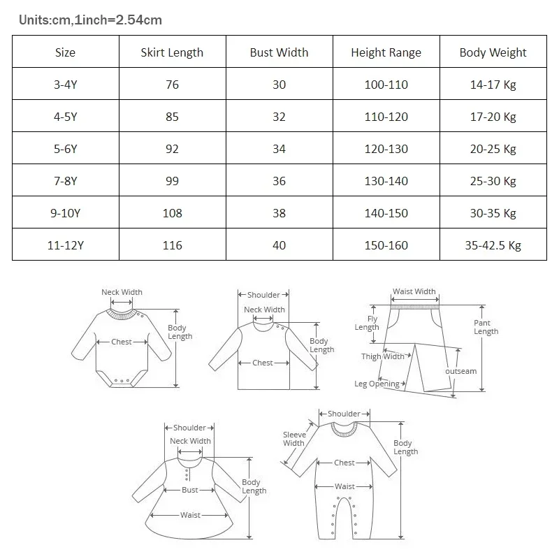 Notes: Please check the Size table before place orderNote:The same age children may have different weight and height, please check the measurement chart carefully before buying.Fat baby should choose a bigger size. If you have any questions, please contact our. Thanks!!!All units are centimeters .Manual measurement,error about 1- 2cm,1inch=2.54cmSizeSkirt LengthBust WidthHeight RangeBody Weight3-4Y7630100-11014-17 Kg4-5Y8532110-12017-20 Kg5-6Y9234120-13020-25 Kg7-8Y9936130-14025-30 Kg9-10Y10838140-15030-35 Kg11-12Y11640150-16035-42.5 Kg