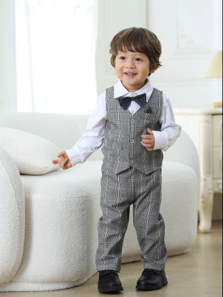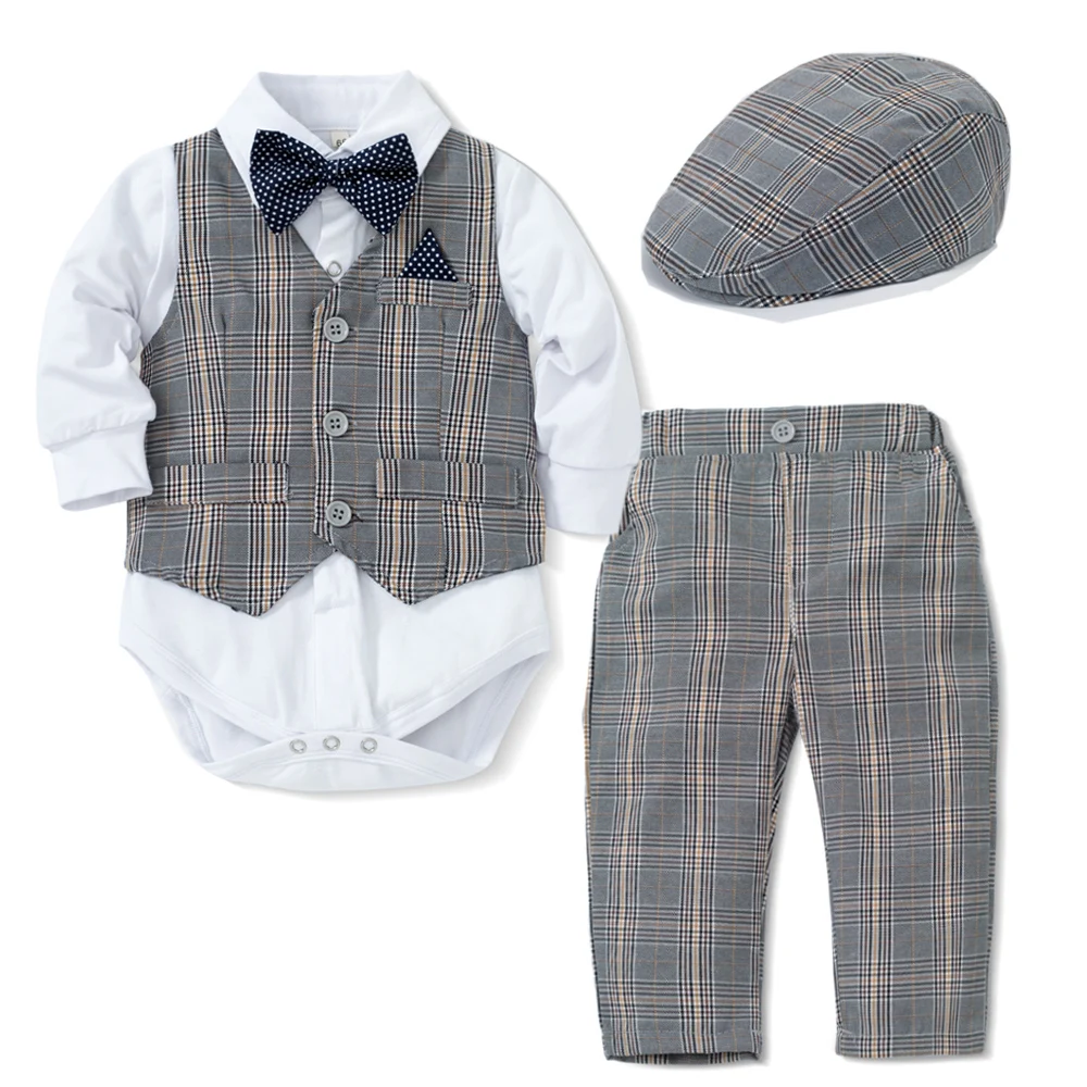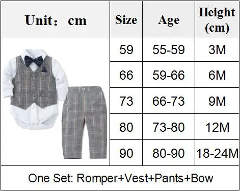 Name: Boys Autumn Gentleman Set Infant OutfitsOne set : Hat + Romper + Pants + Vest + BowFabric: Cotton Season: Spring AutumnAge: 3-24 MonthsSize: 59 66 73 80 90Note: ①Please choose the size according to the child's height and weight, the AGE IS FOR REFERENCE ONLY!②There maybe have 1-3cm error and beacuse the lighting, the color maybe not 100% as same as the picture. Please understand. If you have any questions, please feel free to tell us. We will help you to solve it. Thanks!Common ProblemQ1: If I order today when can it be delivered?A1: Dear friend, we'll sent out the package within 48 hours if it in stock. If out of stock, we'll sent out by3-7 days.Q2: When can I get my order?A2: Dear friend, normal express delivery time is 15-60 days, please be patient. Q3: What should I do if I didn't receive the package?A3:Dear friend, you can contact the post office and get your package. Usually packages are kept at the post office. If you can't find the package after contacting the post office, please contact us in time.Q4: What size should my baby choose?A4: Dear friend, please refer to the size chart to choose the correct size, if your baby is overweight, please choose one size up.Q5: What should I do if my clothes have quality problems or other problems like missing a piece of dress/receiving the wrong dress? A5: Dear friend, if you have any problems mentioned above, please contact us in time, we will try our best to solve it for you.