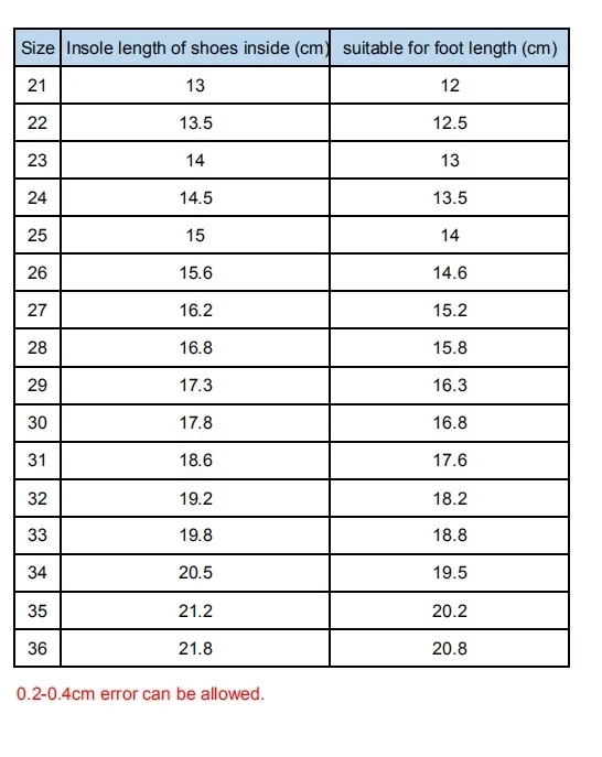 Color: pink, purple, goldSize: 21-36How to choose right size?Foot length + about 1cm = our insole length