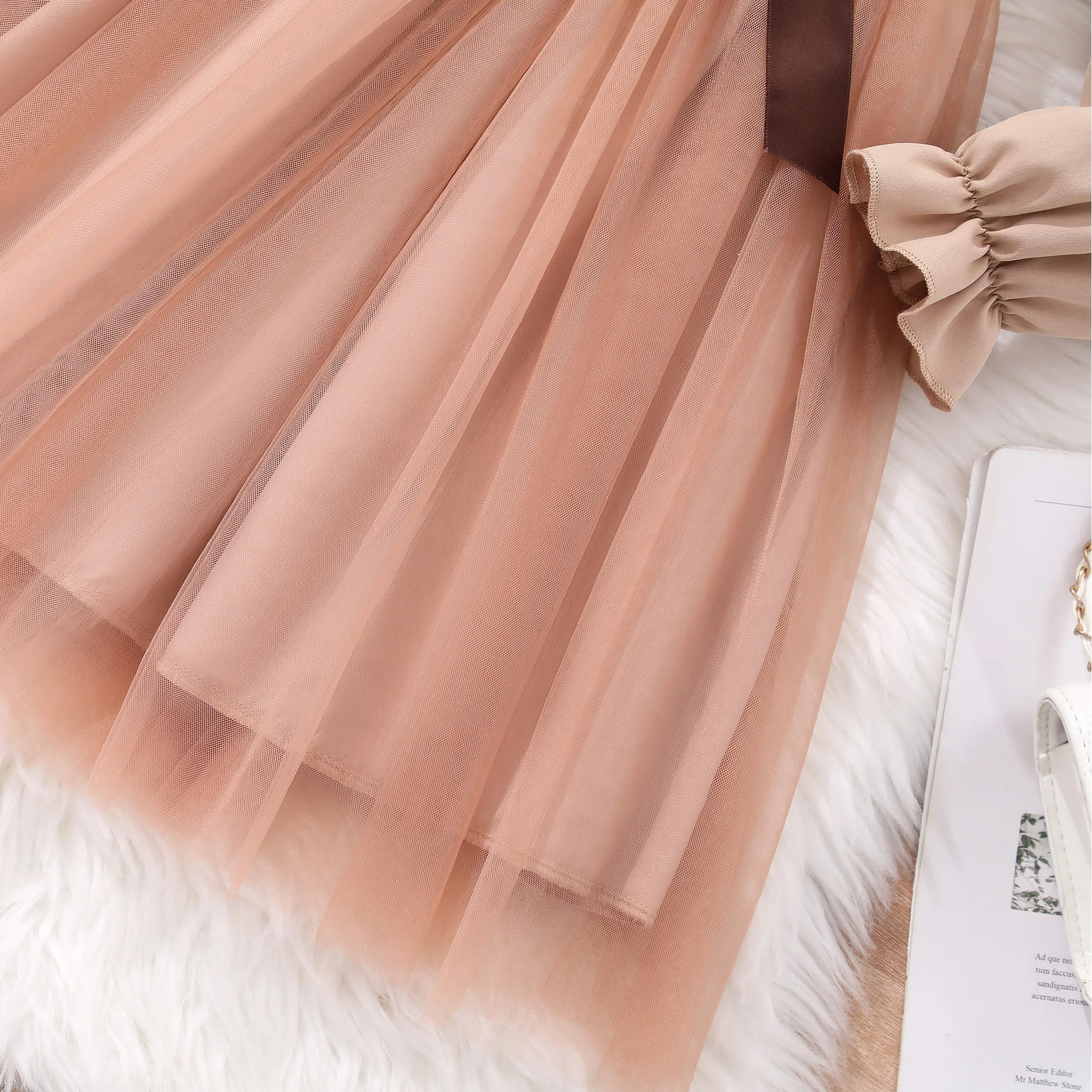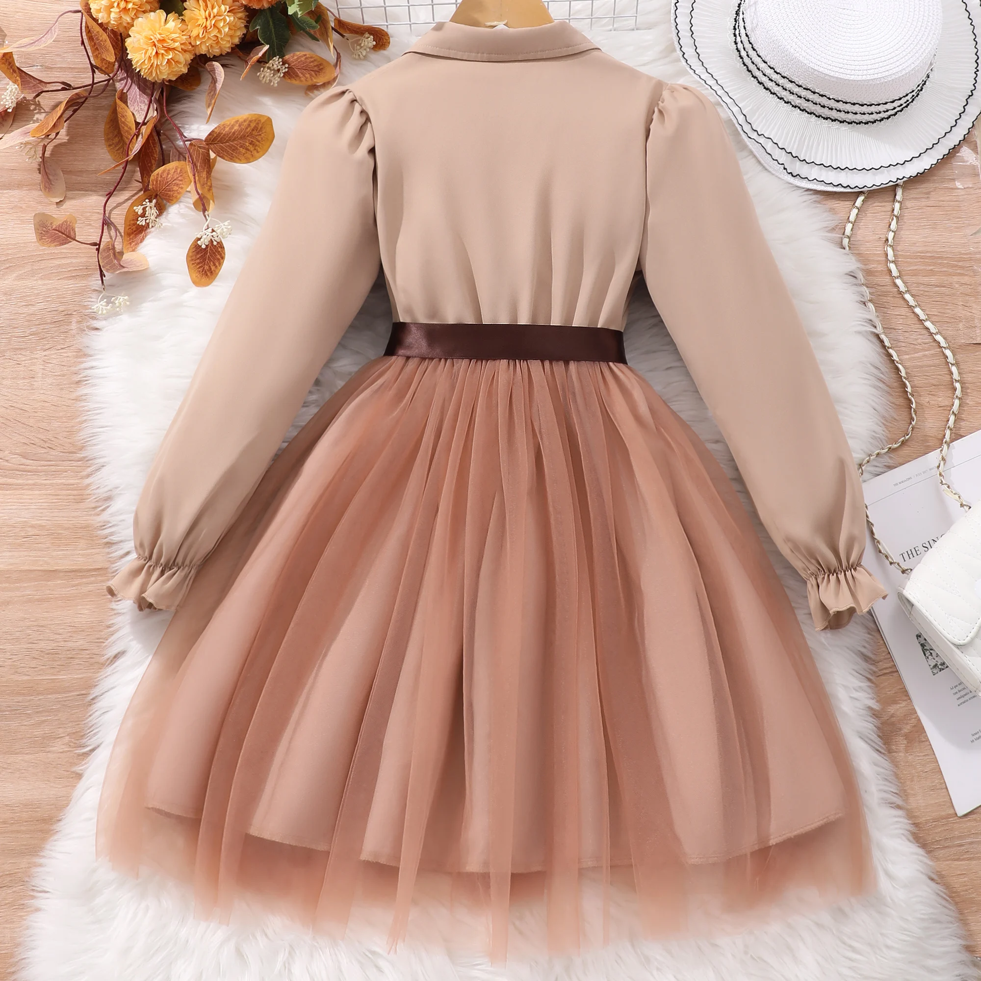 Elegant DesignThe girls' long sleeved lapel solid color mesh dress exudes elegance with its sleek design, perfect for any casual occasion.Comfortable MaterialCrafted from a soft, mesh fabric, this dress ensures comfort for your little one, allowing her to move freely and happily.Durable ConstructionThe dress is built to last, with a construction that resists wear and tear, ensuring it stays a favorite in your child's wardrobe for a long time.Suitable for Various OccasionsWhether it's a family gathering or a casual outing, this dress is a versatile choice that fits all kinds of occasions.Versatile WaistbandEquipped with a woven waistband, this dress offers a stylish and adjustable fit that can be easily cinched in or loosened out.