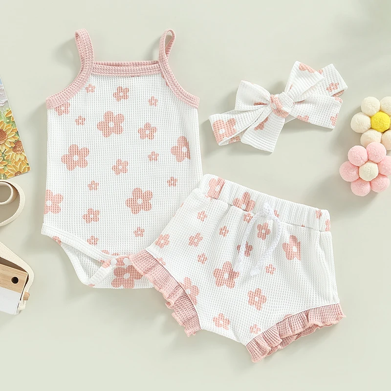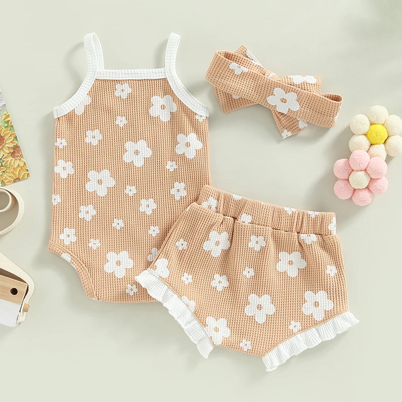 Baby Girl Summer Rompers Set Floral Spaghetti Straps Sleeveless Jumpsuit and Casual Ruffle Shorts HeadbandFeaturesFloral print, spaghetti straps, summer casual sleeveless newborn jumpsuit, casual ruffled shorts and headbands, make the baby more cute, your little one will receive many compliments wearing it.Suitable for everyday casual wear, outdoor play, weddings, holidays, birthday parties, family gatherings, photography.Size(cm)/(inch)70Advised Age:0-3 MonthsRomper Length:36/14.17 Bust:46/18.11 Shorts Length:19/7.48 Waist:36/14.17 80Advised Age:3-6 MonthsRomper Length:38/14.96 Bust:48/18.90 Shorts Length:20/7.87 Waist:38/14.96 90Advised Age:6-12 MonthsRomper Length:40/15.75 Bust:50/19.69 Shorts Length:21/8.27 Waist:40/15.75 100Advised Age:12-18 MonthsRomper Length:42/16.54 Bust:52/20.47 Shorts Length:22/8.66 Waist:42/16.54 SpecificationMaterial: Cotton BlendStyle: CasualGender: GirlSeason: SummerQuantity: 3pcs Pattern: Floral PrintSleeve: SleevelessOccasions: DailyPackage Including:1* Jumpsuit1* Shorts1* HeadbandNote:There may be 1-2 cm deviation in different sizes, locations and stretch of fabrics. Size chart is for reference only; there may be a little difference with what you get. Color may be lighter or darker due to the different PC display.PromiseIf the product has any quality problems, please feel free to contact us, we will help you solve the problem as quickly as possible.