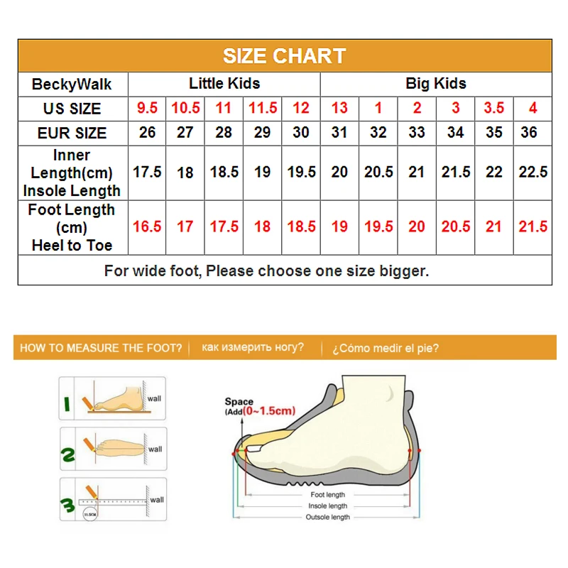 Please check our size chart below. Please choose size according to the "FOOT LENGTH".Find the foot length you need, then find the corresponding US SIZE for making order.Remarks: The US or EUR SIZE is not the standard of the international. Pack without shoes box.SIZE CHARTBeckyWalkToddlerLittle KidsBig KidsUS SIZE5.567899.510.51111.512131233.54EUR SIZE21222324252627282930313233343536Inner Length(cm)Insole Length—–17.51818.51919.52020.52121.52222.5Foot Length (cm)Heel to Toe—–16.51717.51818.51919.52020.52121.5For wide foot, Please choose one size bigger.