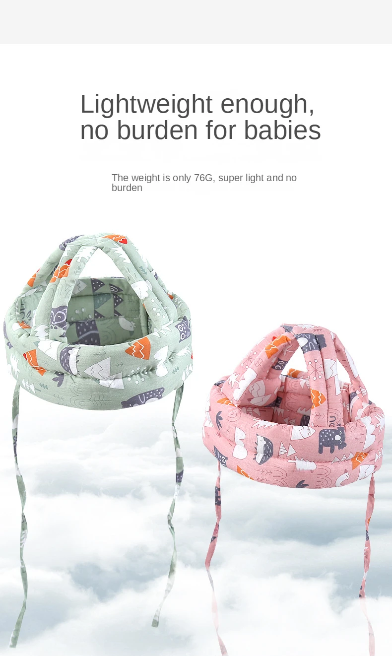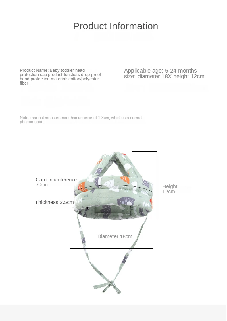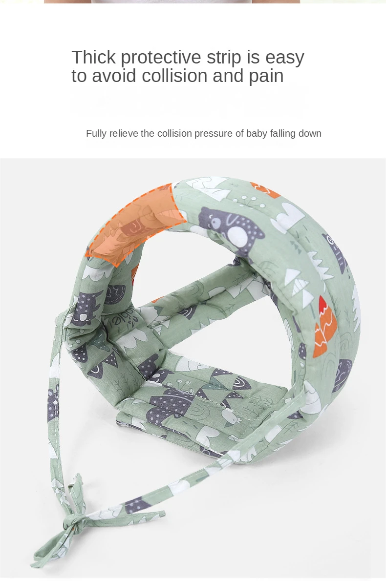 Recommended age: 0-5 years oldMaterial:The padding layer is made of high-density and elastic sponge, which reduces the impact on impact and is comfortable and breathable.Features:It has the function of blocking and buffering, which can protect the baby's head from being hurt by the collision when the baby's head falls;Velcro design, head circumference can be adjusted freely.