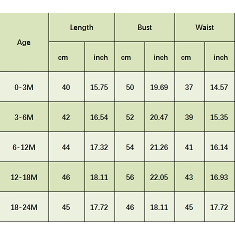 3-6M Length: 16.54 Bust: 21.26 Waist: 15.35 Advised Age: 3-6 Months