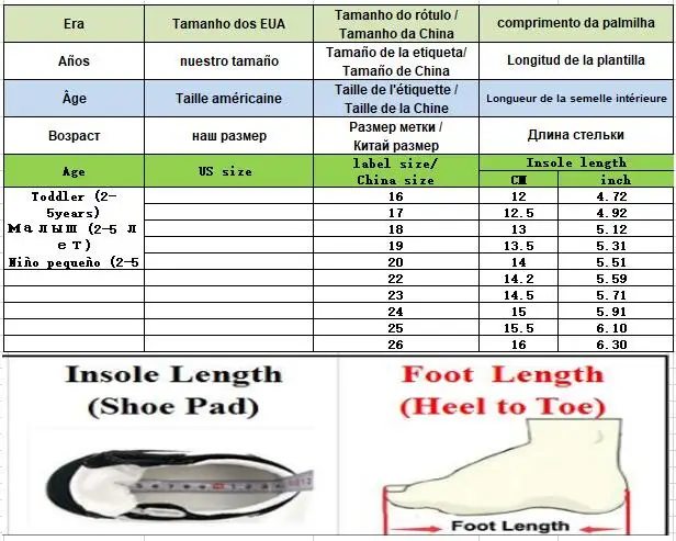 Please Check the shoes insole length of your baby Before place an order . We send shoes as the insole length .Thank You !!!!!!Note:Foot Length +(0.5~1)cm=insole lengthCN 16 insole 12cmCN 17 insole 12.5cmCN 18 insole 13cmCN 19 insole 13.5cmCN 20 insole 14cmCN 22 insole 14.2cmCN 23 insole 14.5cmCN 24 insole 15cmCN 25 insole 15.5cmCN 26 insole 16cm