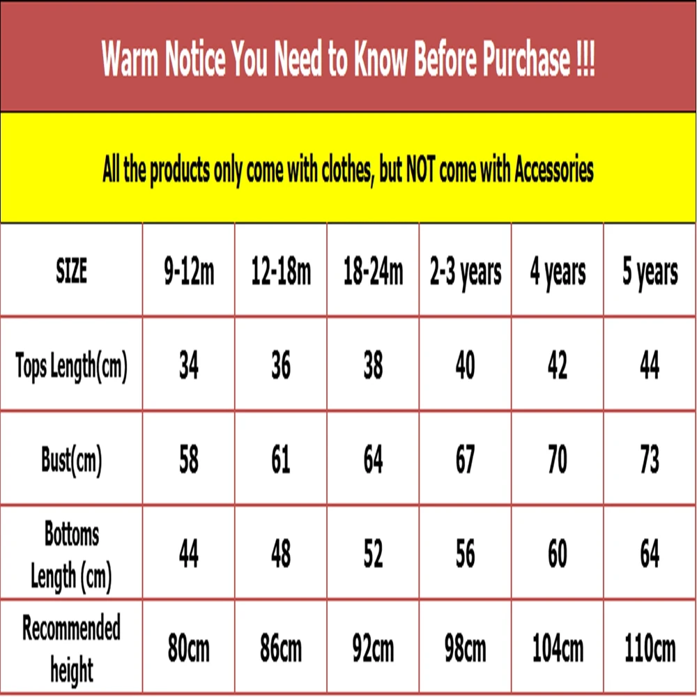 Winter Warm Little Kids Clothing Sets Long Sleeve Tops + Trousers 2Pcs CuteItem No.: BCW3059Fabric: 100% PolyesterSeason: WinterFeature: O-neck and cute pattern for babyCare instruction: Machine wash ; Cool Iron ; Mild process if dry cleanDo not bleach ; Do not tumble drySize9-12m Tops Length 34(cm) Bust 58(cm) Pants Length 44(cm)12-18m Tops Length 36(cm) Bust 61(cm) Pants Length 48(cm)18-24m Tops Length 38(cm) Bust 64(cm) Pants Length 52(cm)2-3 years Tops Length 40(cm) Bust 67(cm) Pants Length 56(cm)4 years Tops Length 42(cm) Bust 70(cm) Pants Length 60(cm)5 years Tops Length 44(cm) Bust 73(cm) Pants Length 64(cm)* Size measurements may be 1-3 cm difference.* Different machine screens may occur color difference.* Note: All printings are hand painted. The pattern may be slightly different in each cloth.